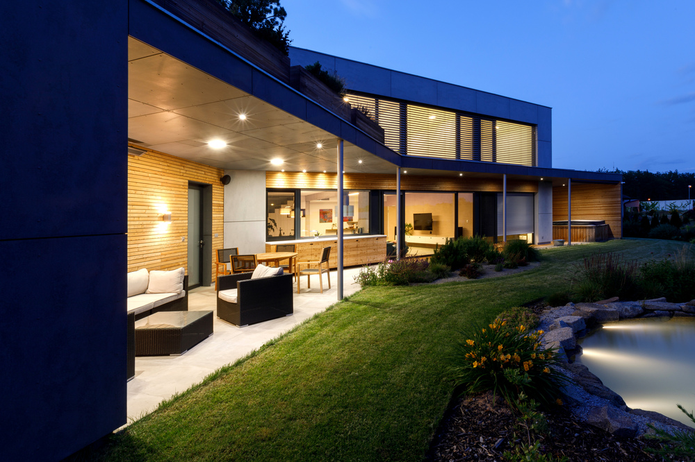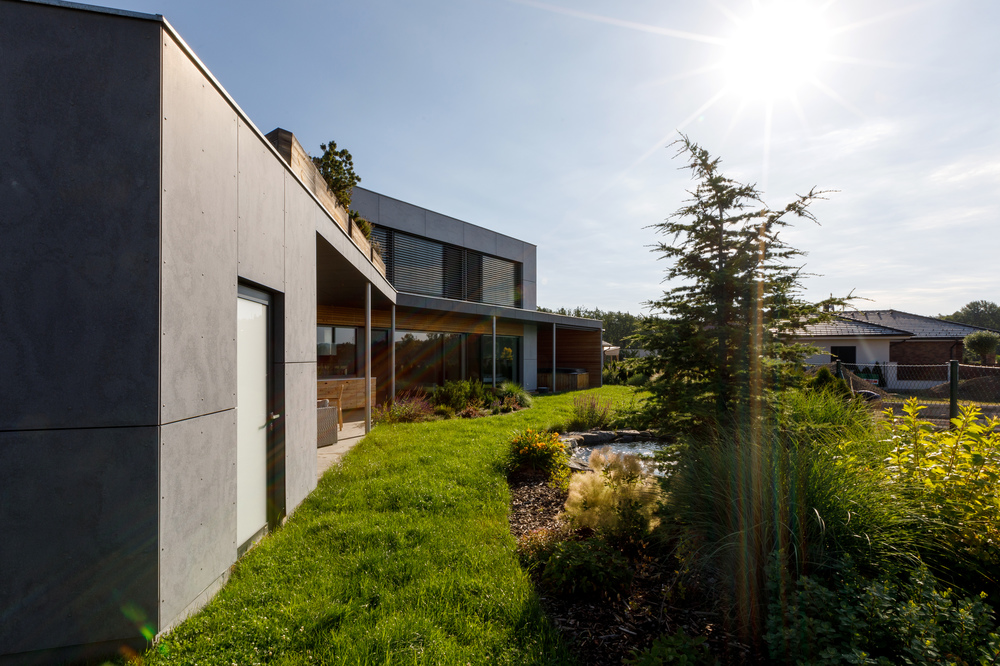 Mierne zalomený tvar domu chráni aj zútulňuje terasu, ktorá sa stala obľúbeným víkendovým miestom na grilovanie. Relaxačnú oázu dotvára aj prírodné jazierko, ktorého nenáročnosť na údržbu si majiteľ nemôže vynachváliť. Prízemná časť objektu nadväzuje na dispozíciu dvojpodlažnej časti a tvary spevnených plôch – dochádza tým k rozbitiu tradičného kvádra a hmoty domu sú umiestnené voľne v záhrade. Fasády domu sú riešené z fasádnych dosiek alebo smrekovcových lát a presklenými plochami. To umocňuje prirodzenosť domu a prepojenie so záhradou.