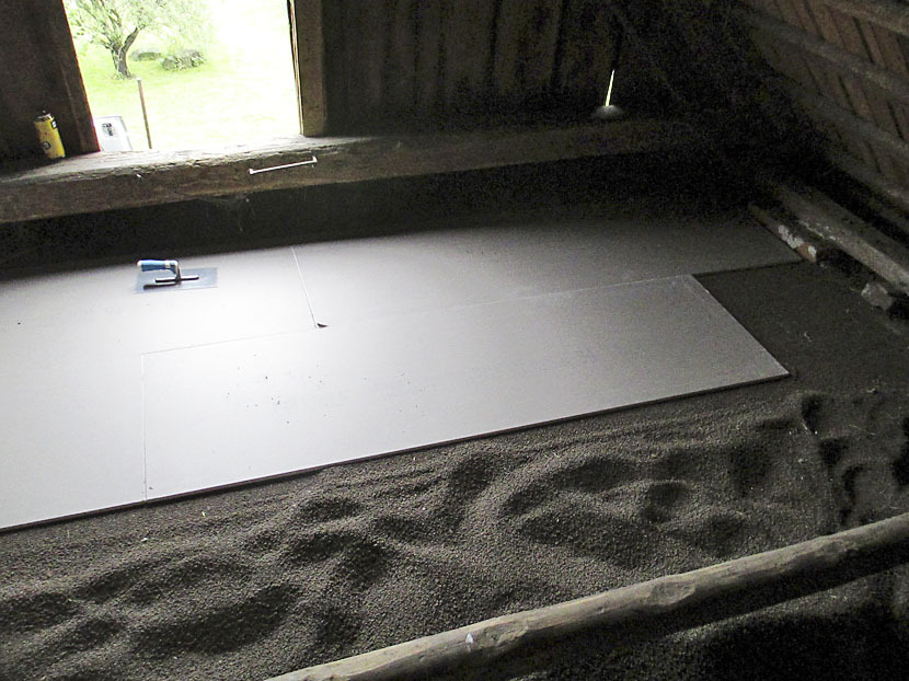Na rovný podklad možno suchú dlážku inštalovať priamo (OSB záklopka na drevenom strope, rovný betónový alebo keramický strop). Pri nerovných vrstvách (krivá betónová mazanina, hlina, škvara) treba aplikovať separačnú fóliu a suchý vyrovnávací podsyp (frakcia 1–4 mm) s hrúbkou od 20 do 60 mm. Na zníženie krokového hluku možno dlážku pokladať na minerálnu izoláciu alebo drevovláknitú izolačnú dosku. Na zateplenie konštrukcie možno použiť dlážkový polystyrén EPS 200 S (EPS 150 S) s hrúbkou do 10 cm.