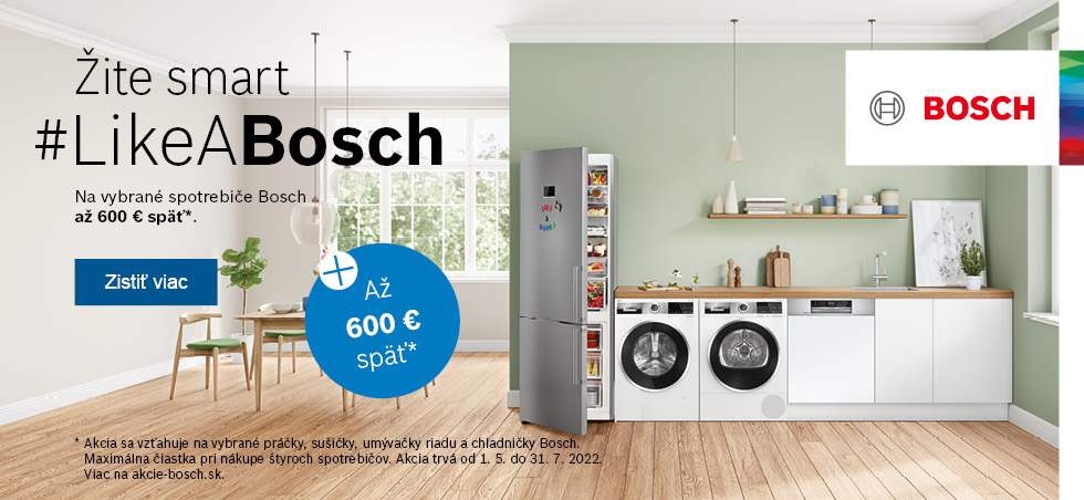 Do 31. júla 2022 prebieha špeciálna akcia a zákazníci môžu pri nákupe vybraných spotrebičov Bosch – práčok, kombinovaných práčok so sušičkou, sušičiek bielizne, umývačiek riadu a chladničiek – získať až 600 EUR späť.2 Viac informácií a pravidlá akcie sú k dispozícii na: akcie-bosch.sk.