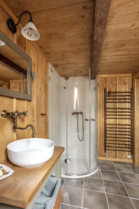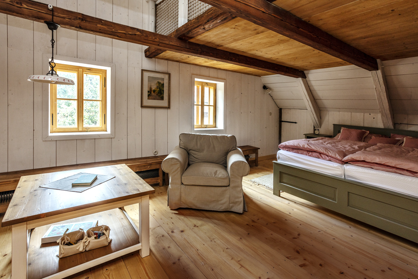Podkrovie je kompletne nové, ale opäť s dôrazom na pôvodnú remeselnú techniku. Vidno to na dlážke, kde použili širokú kefovanú dosku, ale aj na stenách. „Keby sme na steny použili hobľované palubovky, prišli by sme vďaka ich dokonalým povrchom o krásnu atmosféru. Preto sme siahli po rezaných „chlpatých“ doskách a len sme ich naolejovali.“