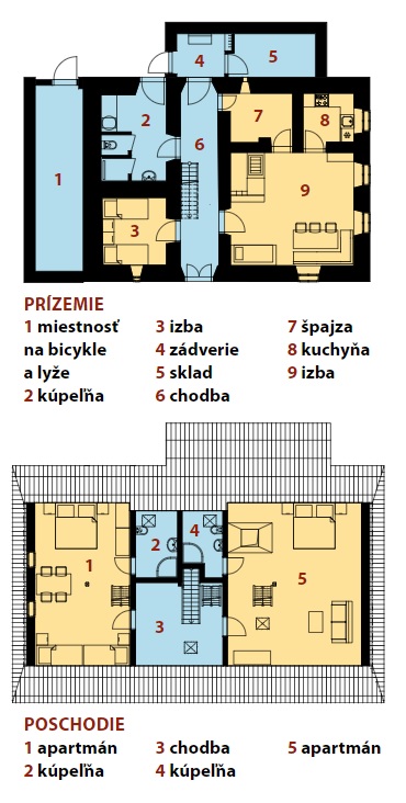 Dispozícia na prízemí zostala viacmenej pôvodná vrátane izbice, len kuchynku majitelia vytvorili z pôvodnej komory, a tým zväčšili priestor izbice. Kúpeľňu vybudovali v pôvodnom kamennom chlieve. Na prízemí sa nachádza ešte jedna miestnosť s klenutým stropom a dvomi posteľami, ktorá v 19. storočí slúžila ako sklad. Vtedy sa totiž väčšinou žilo v izbe, kde sa varilo, jedlo, kúrilo i spalo.