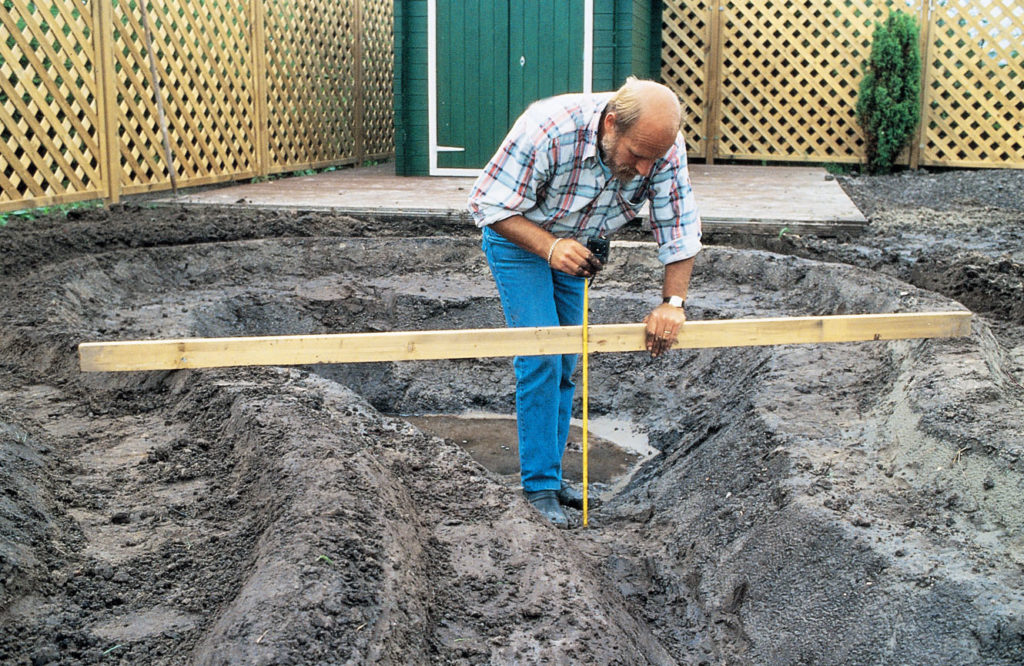 Jama pre jazierko sa kope od okrajov smerom dovnútra. Dno musí byť o 20-25 cm hlbšie než plánovaná hladina vody. Pri kopaní vymodelujte jednotlivé hĺbkové zóny. Okolo okraja vytvorte priekopu s hĺbkou 15 cm ako bariéru proti kapilárnej vzlínavosti. Dôležité je, aby vonkajšie okraje jazierka ležali presne v rovine. Naprieč jazierkom položte porovnávaciu latu a jej vodorovnú polohu overte vodováhou. Tento postup sa opakuje na rôznych miestach. Na jednom mieste sa môže okraj trochu znížiť, aby pri veľkom daždi voda riadene odtekala.