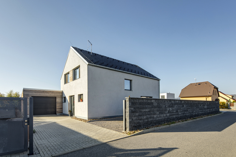 Prevažná časť domu je omietnutá svetlou fasádnou omietkou. Na podporu architektonického výrazu a zvýraznenie kompozície použili medzi oknami v štítoch obkladové drevo a rovnako drevom obložili priľahlú garáž. Aj komín z nehrdzavejúcej ocele na fasáde štítovej steny vytvorí nezanedbateľný prvok dotvárajúci architektúru domu.