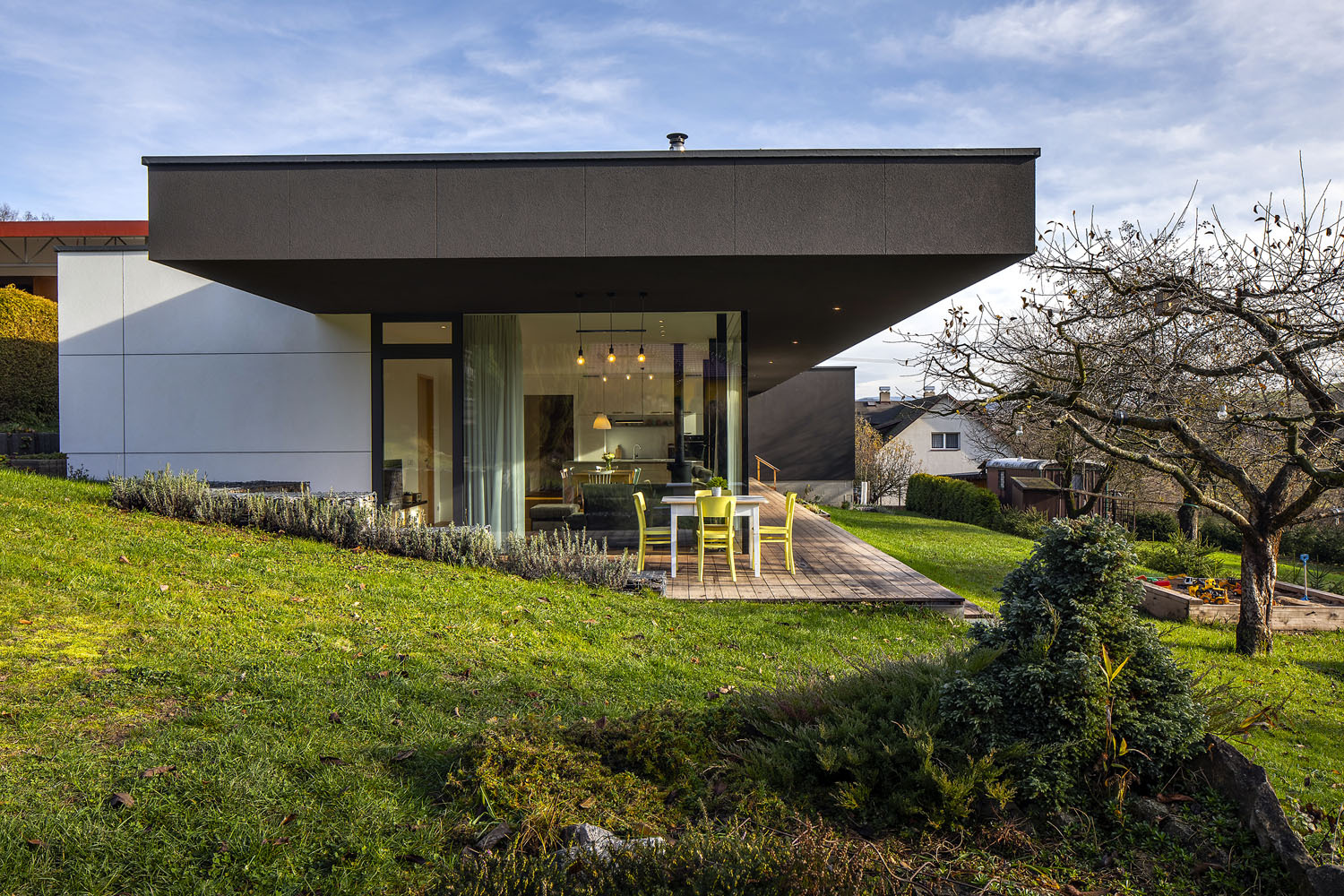 Prízemná stavba pozdĺžneho pôdorysu a jednoduchého kubického tvaru je usadená po vrstevniciach a orientovaná na juh a do údolia rieky, a korešponduje tak nenásilne so svojím okolím. Najvýraznejším architektonickým prvkom je plochá strecha s veľkým presahom. Zakrýva a chráni drevenú terasu na južnej a západnej strane aj vstupné dvere, súčasne prepája dom a garáž. Základná farebnosť je založená na kombinácii čiernej a bielej farby, ktorá zvonku aj v interiéri kontrastuje s premennou farebnosťou záhrady počas roka.