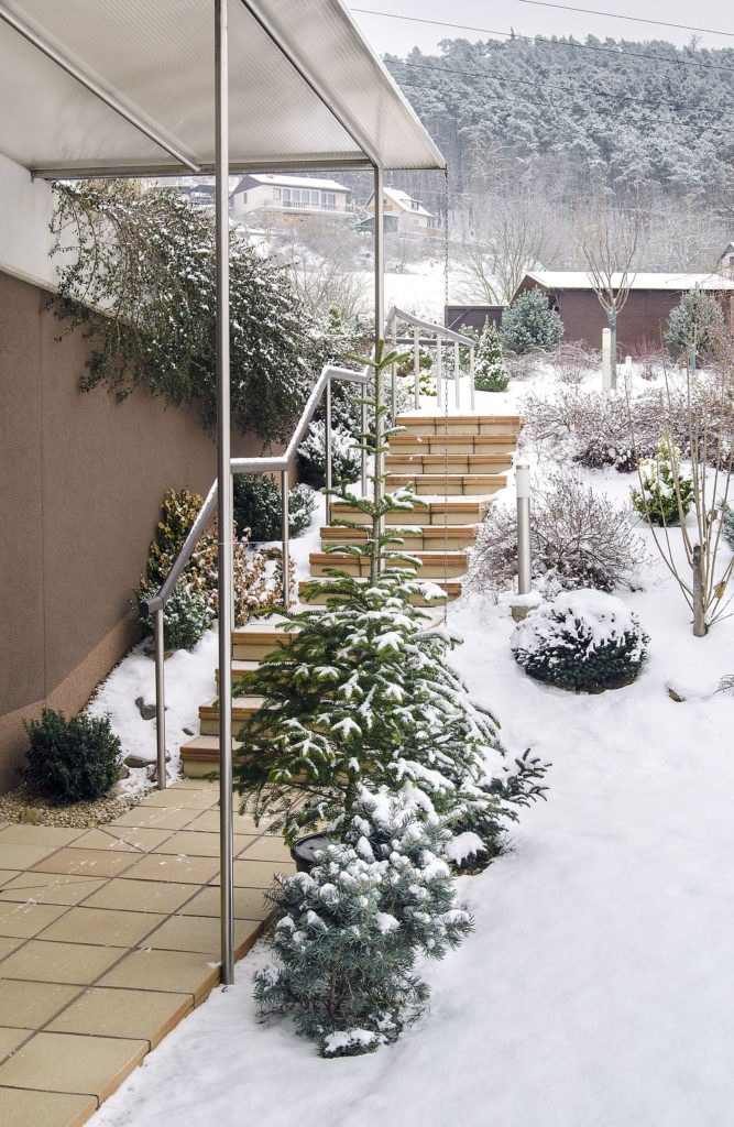 Aby záhrada s opadanými drevinami nepripomínala röntgenovú snímku, potrebovala oživiť vždyzelenými rododendronmi a ihličnanmi, ktorých siluety sa zreteľne rysujú na bielom podklade pri hraniciach pozemku aj vedľa domu. Smreky, jedle, borovice a tisy rastú solitérne či v úhľadných skupinách tak, aby sa dalo prezrieť si ich zo všetkých strán. S chumáčikmi snehu uviaznutými medzi ihličím vyzerajú nežnejšie než kedykoľvek inokedy.