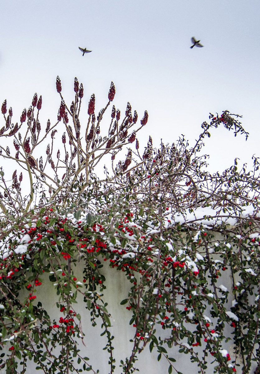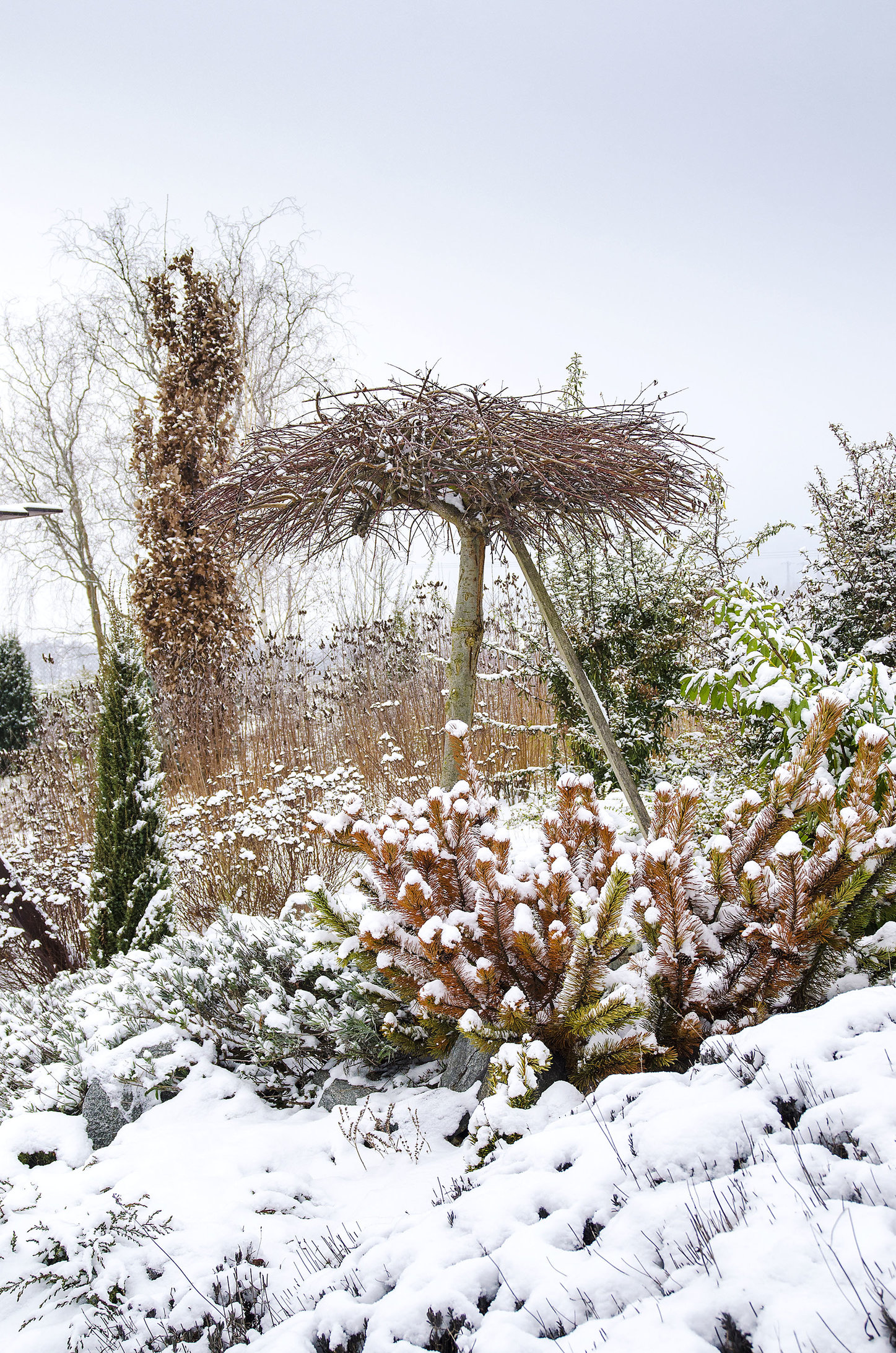 Aby záhrada s opadanými drevinami nepripomínala röntgenovú snímku, potrebovala oživiť vždyzelenými rododendronmi a ihličnanmi, ktorých siluety sa zreteľne rysujú na bielom podklade pri hraniciach pozemku aj vedľa domu. Smreky, jedle, borovice a tisy rastú solitérne či v úhľadných skupinách tak, aby sa dalo prezrieť si ich zo všetkých strán. S chumáčikmi snehu uviaznutými medzi ihličím vyzerajú nežnejšie než kedykoľvek inokedy.