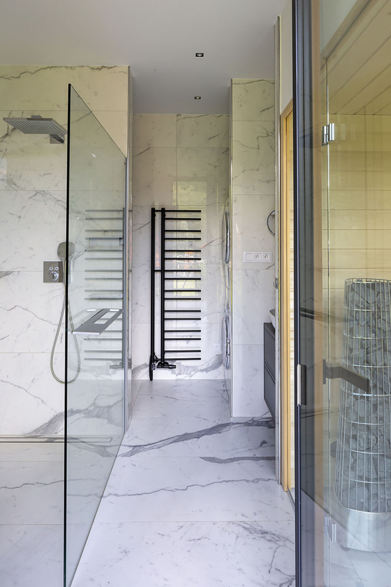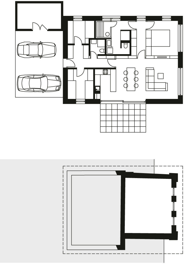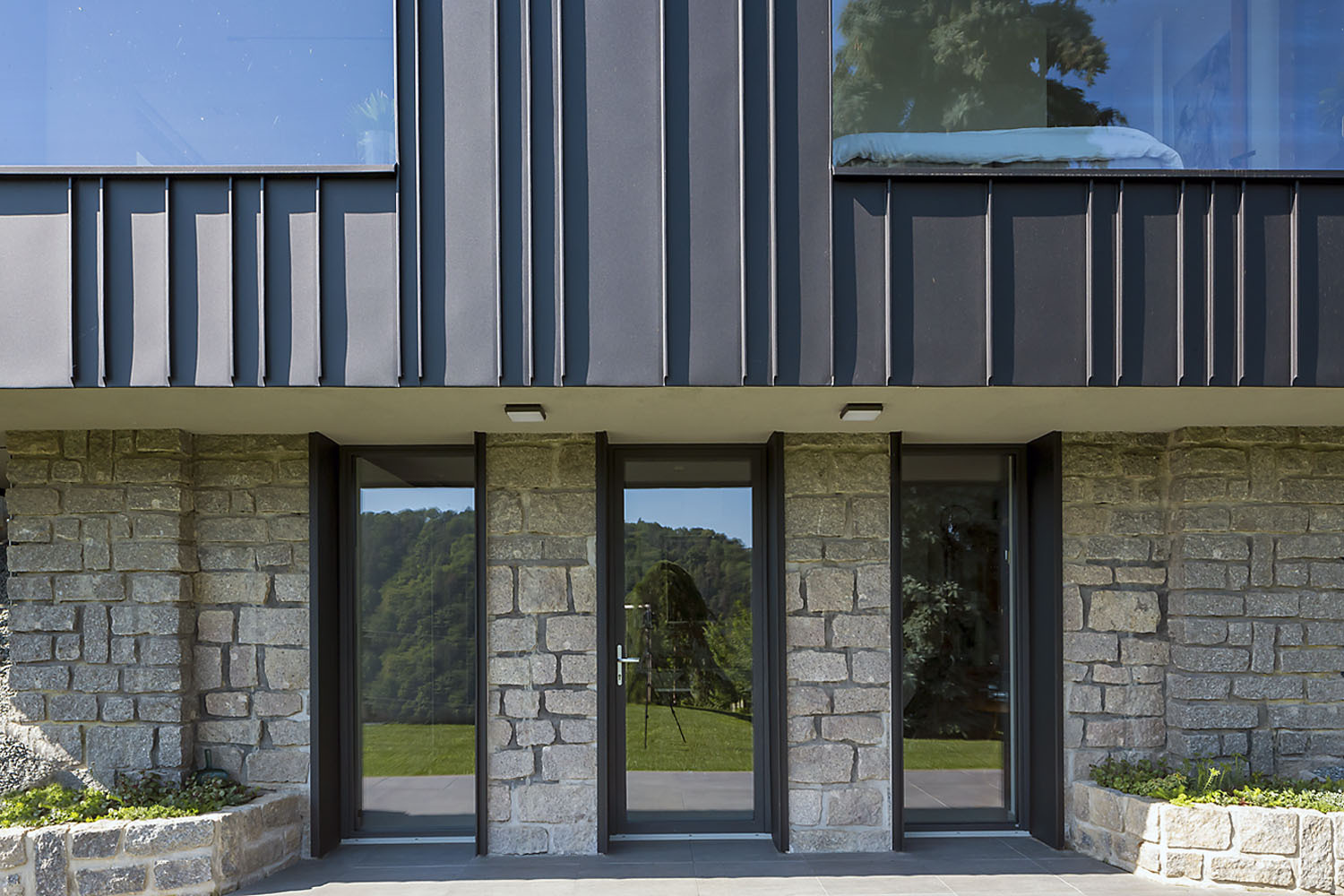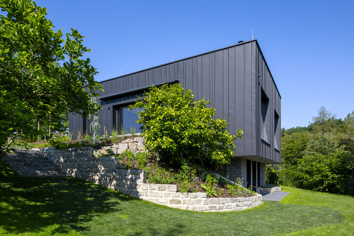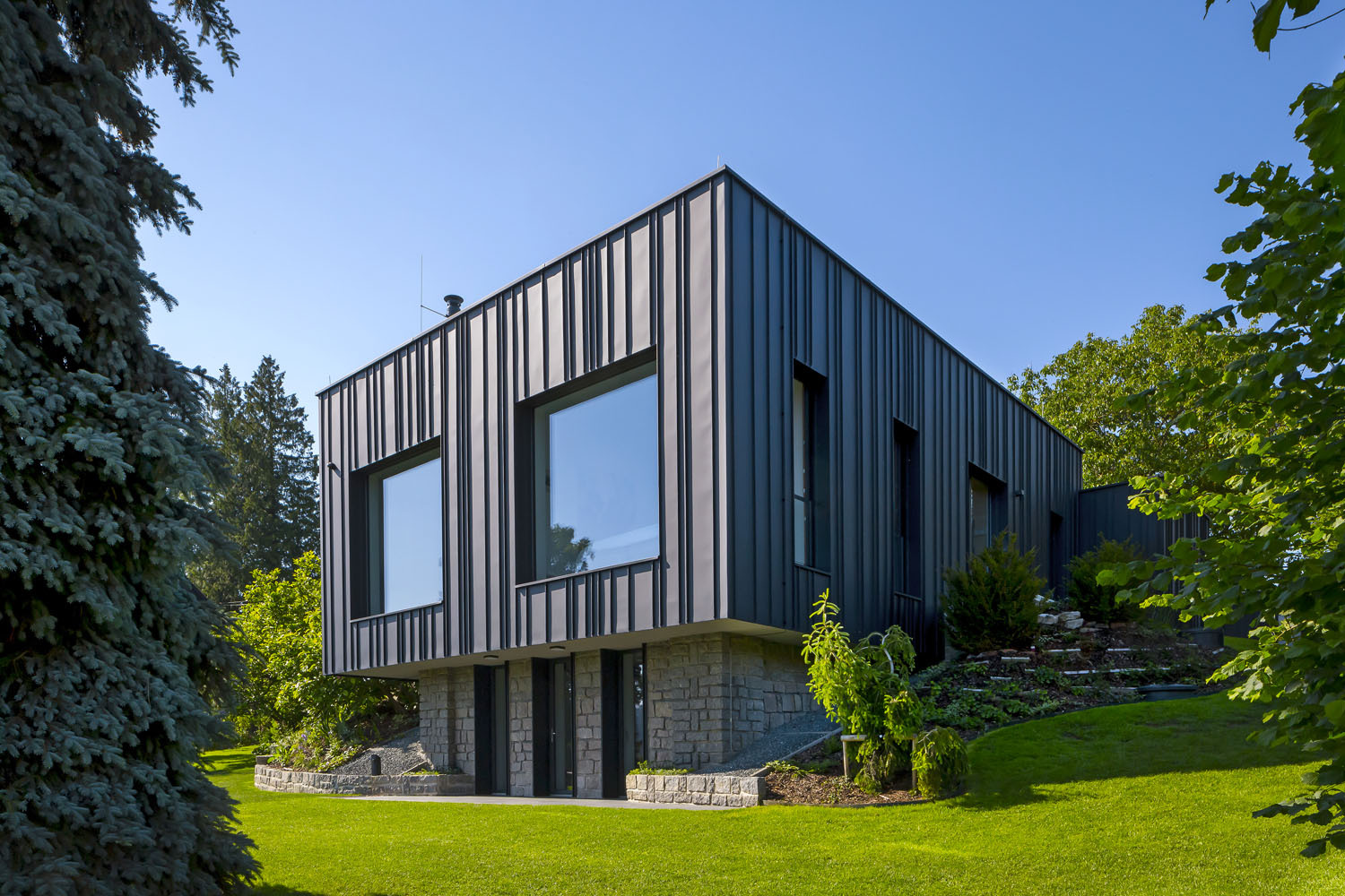 z dutinových tehlových blokov s plochou strechou. Staré murivo z miestneho lomového kameňa prechádza do oporných múrikov vedľa domu. Murivo obaľuje prevetrávaná fasáda z ručne falcovaných zvitkov čierneho plechu, ktorá dodáva stavbe škandinávsky nádych. Prízemie tvorí hlavnú obytnú časť domu, je sčasti prevýšené nad terénom a jeho dominantou sú krásne výhľady. V suteréne, čiastočne zapustenom do svahu, sa nachádza ďalšia izba so samostatným vstupom zo záhrady.
