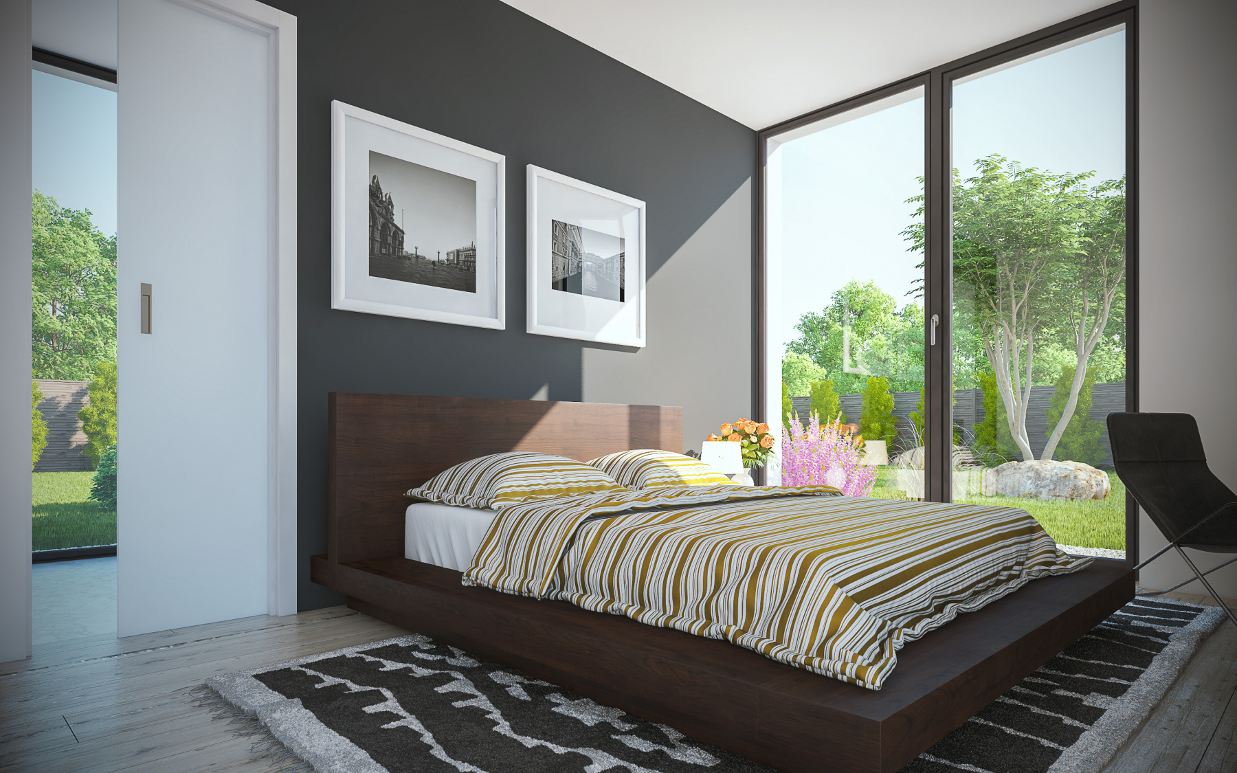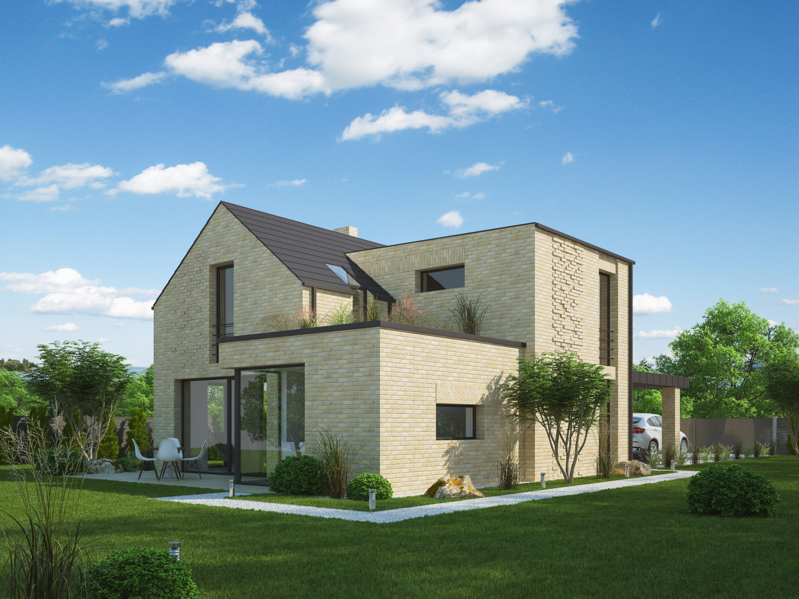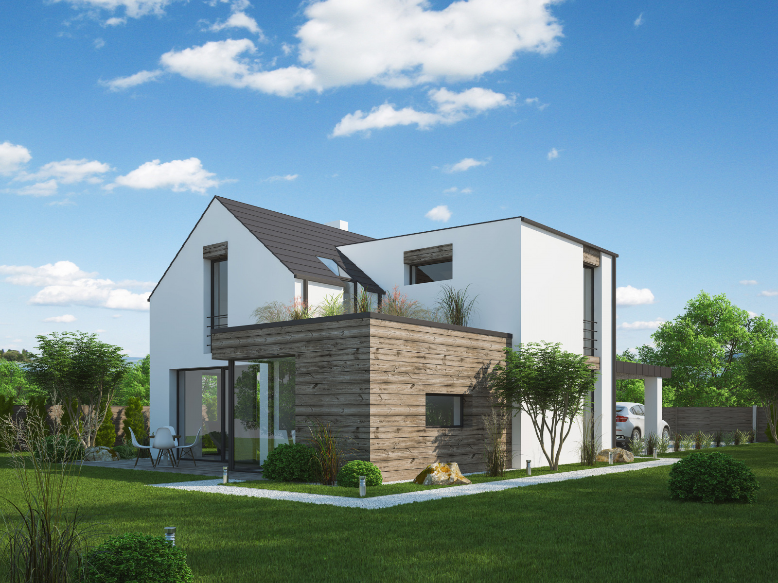 Rozmanito hmotovo členený dom sa otvára do všetkých strán záhrady a ponúka veľkorysý kontakt exteriéru s interiérom, čo ocenia hlavne milovníci záhrady. Ide o jedna z hlavných výhod domu. K ďalším sa radí priestrannosť a dostatok úložných priestorov alebo zabudovaný prístrešok pre auto priamo do hmoty domu. Rodinný dom je navyše variabilný a bez stavebných úprav ponúka výber medzi dispozičným riešením 4 + 1 alebo 5 + 1 zmenou priestrannej šatne v 2.NP na obytnú miestnosť.