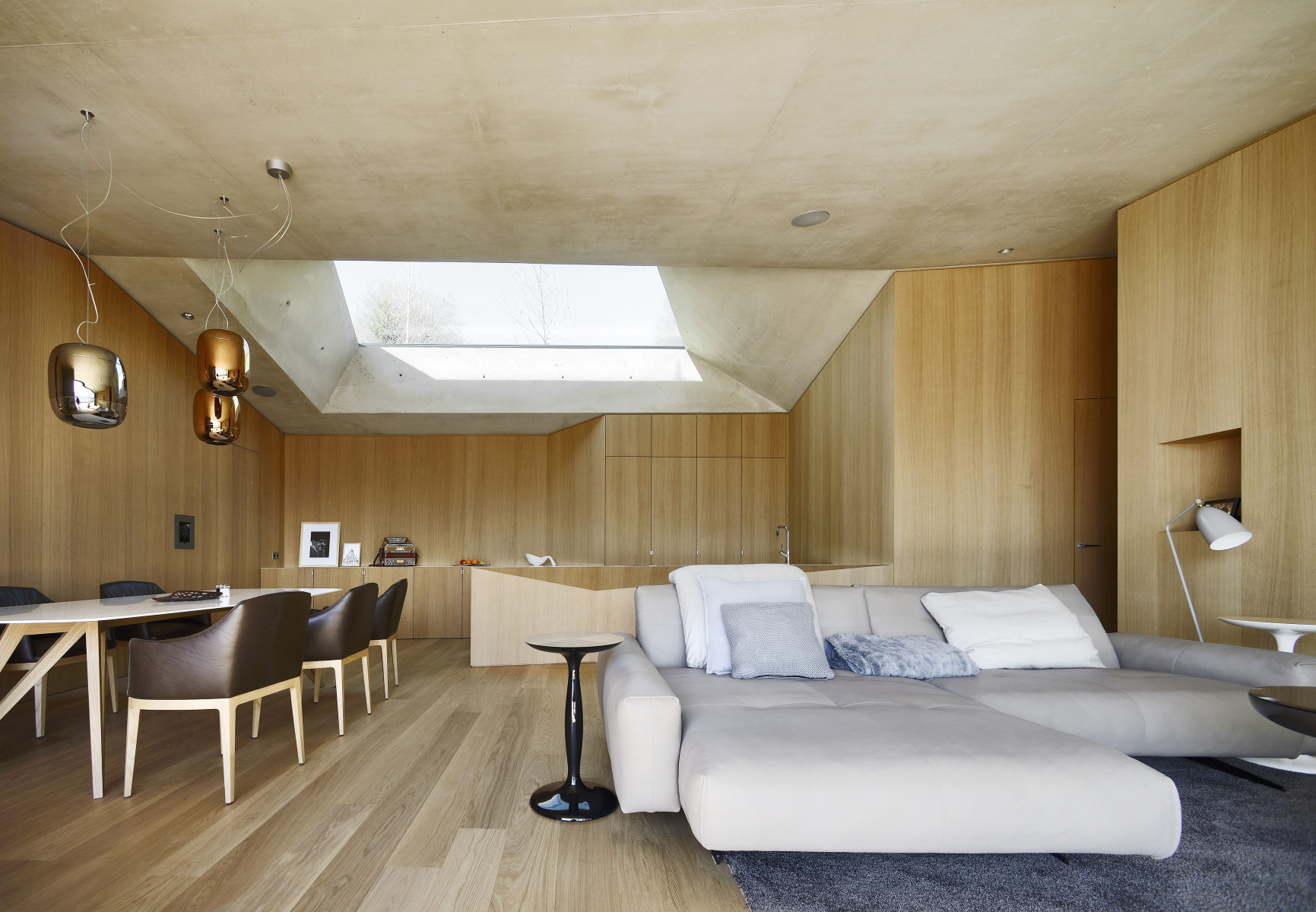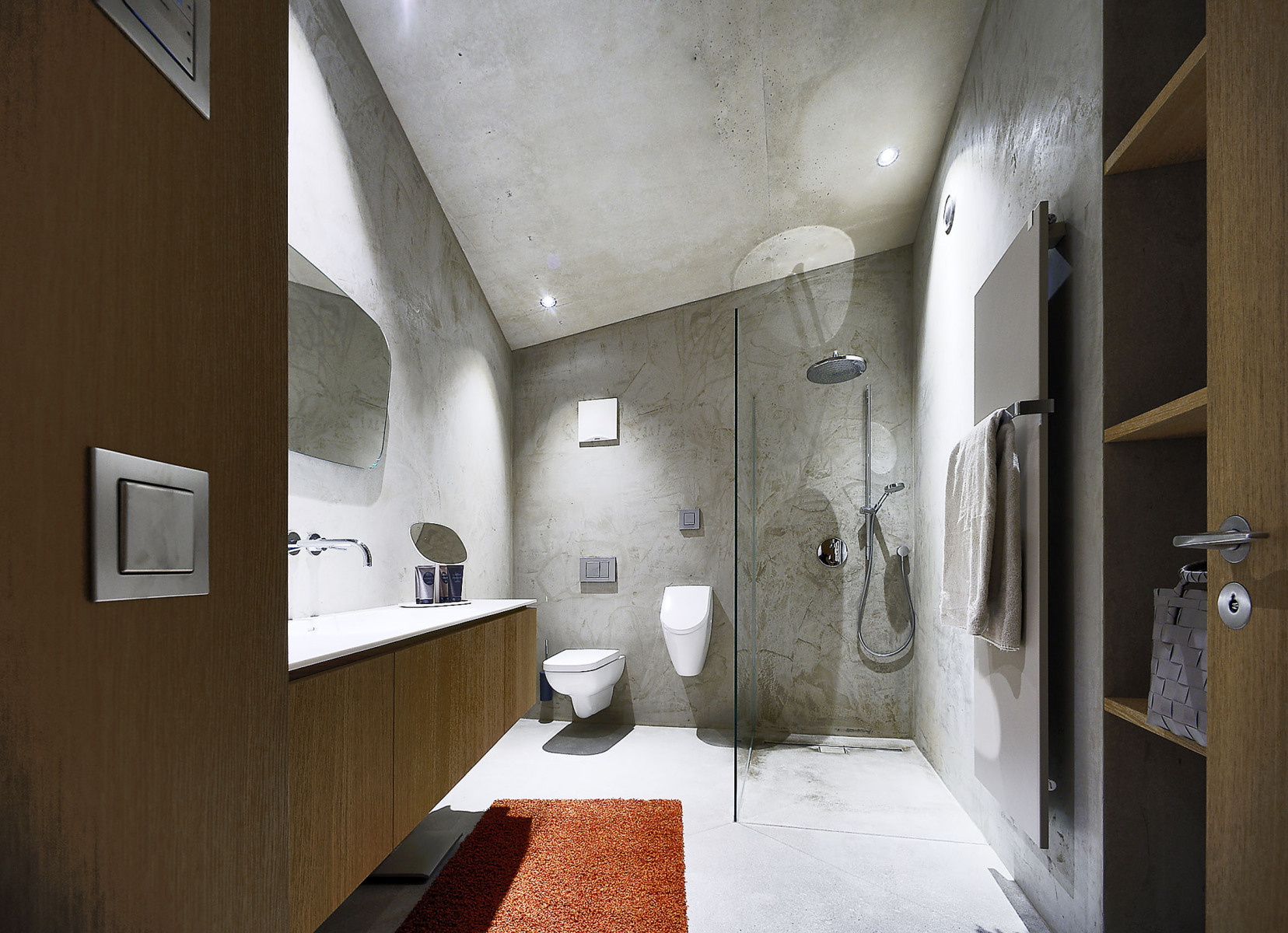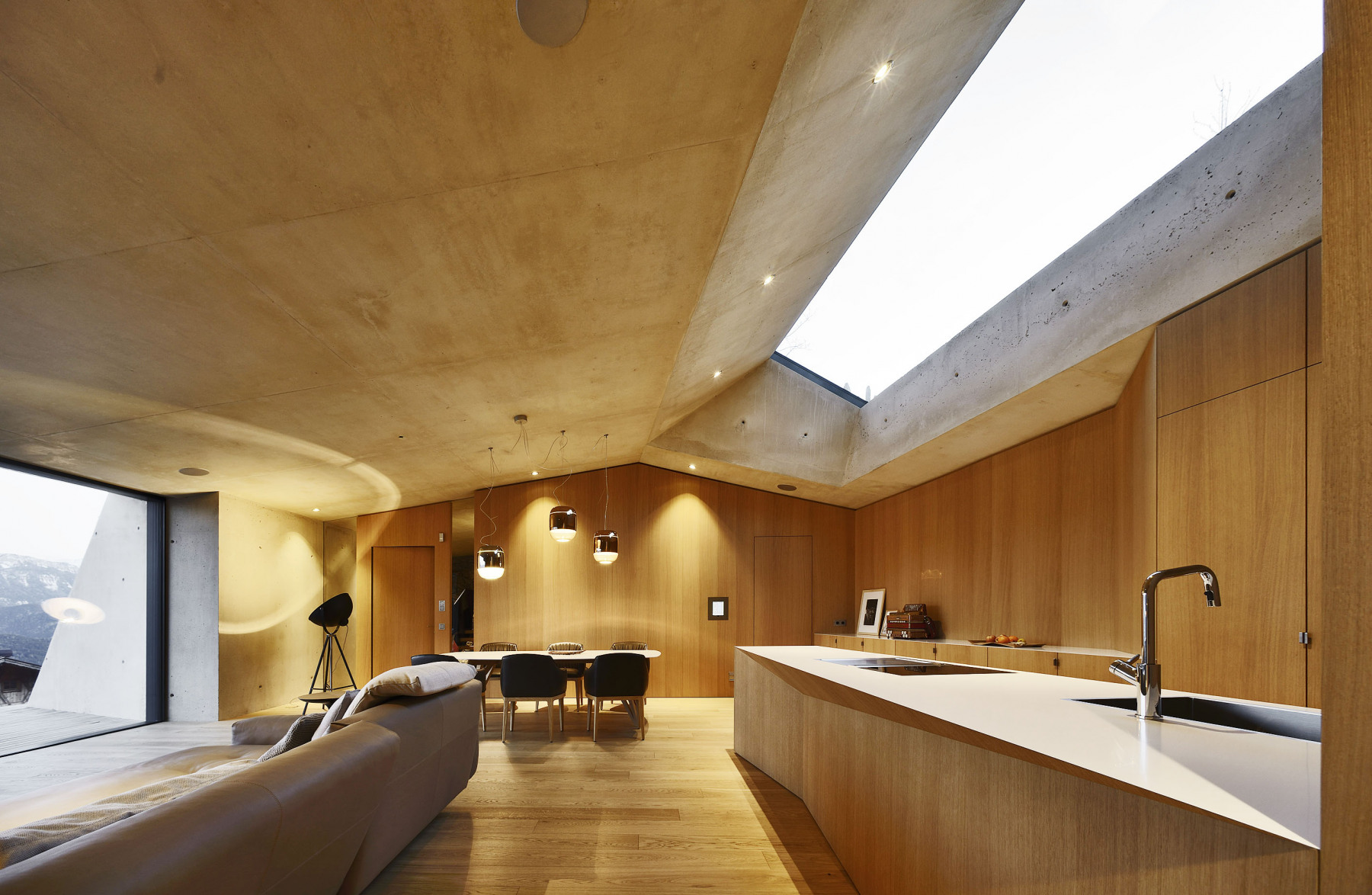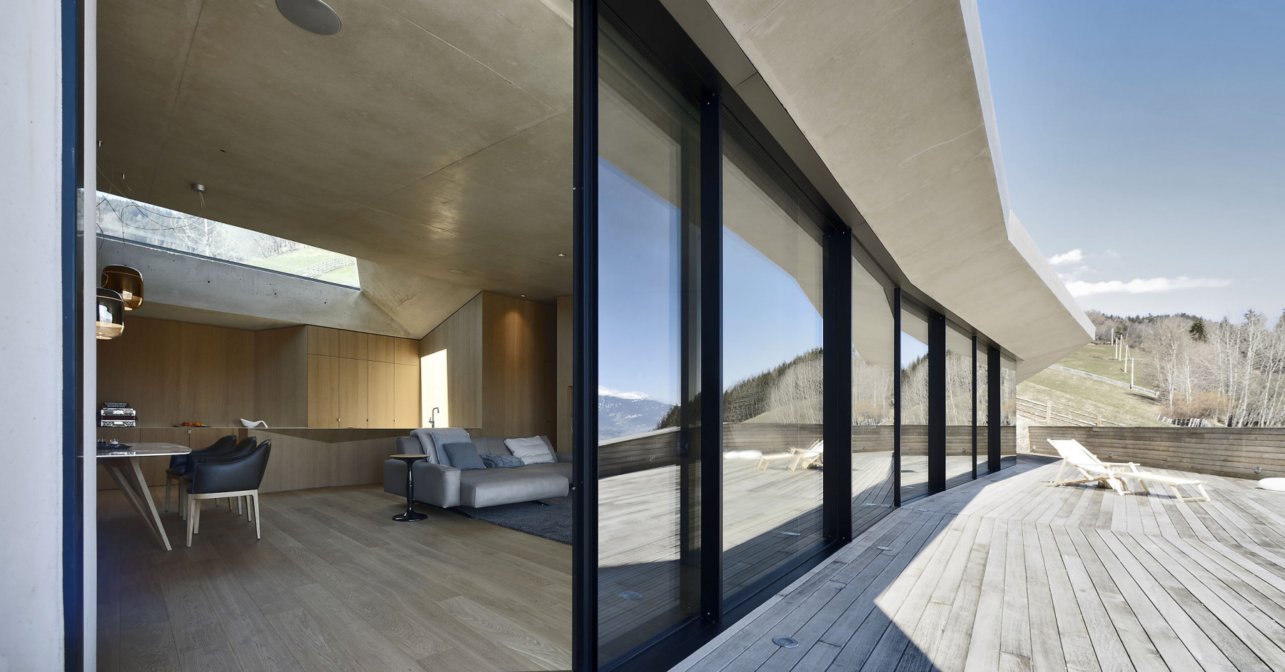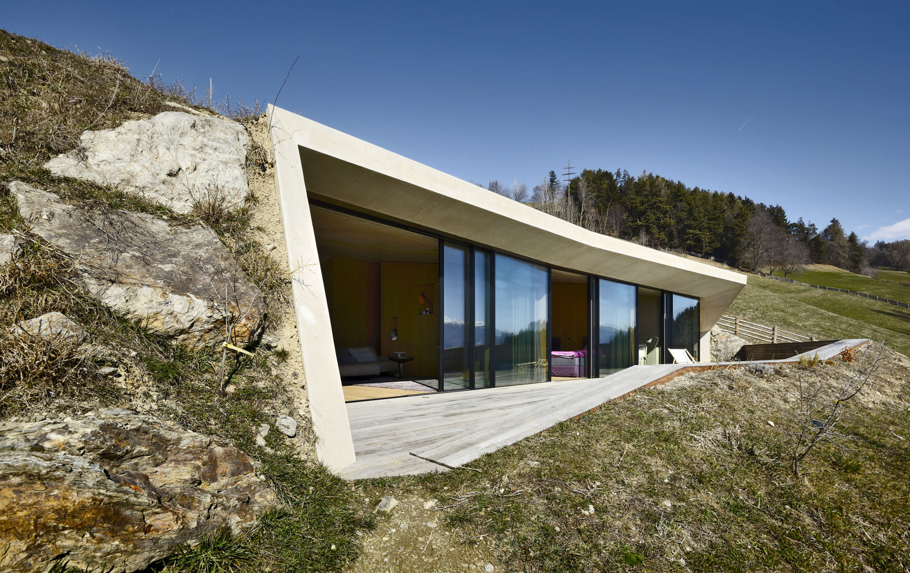 Železobetónová škrupinová konštrukcia sa zarezáva hlboko do stráne a privádza do nej vzduch a svetlo. Konštrukciu väčšinou ponechali v pohľade a odtlačená štruktúra debnenia z hrubých drevených dosiek evokuje prírodný vzhľad. Vo svahu sú zabudované dvojité obvodové steny s vnútornou dutinou, ktorá slúži ako tepelná izolácia. V exteriéri prechádza železobetónová konštrukcia do vonkajšieho rámu, tvoriaceho ochranný a estetický prvok fasády. Dom má ekologickú prevádzku a využíva pasívny solárny efekt.