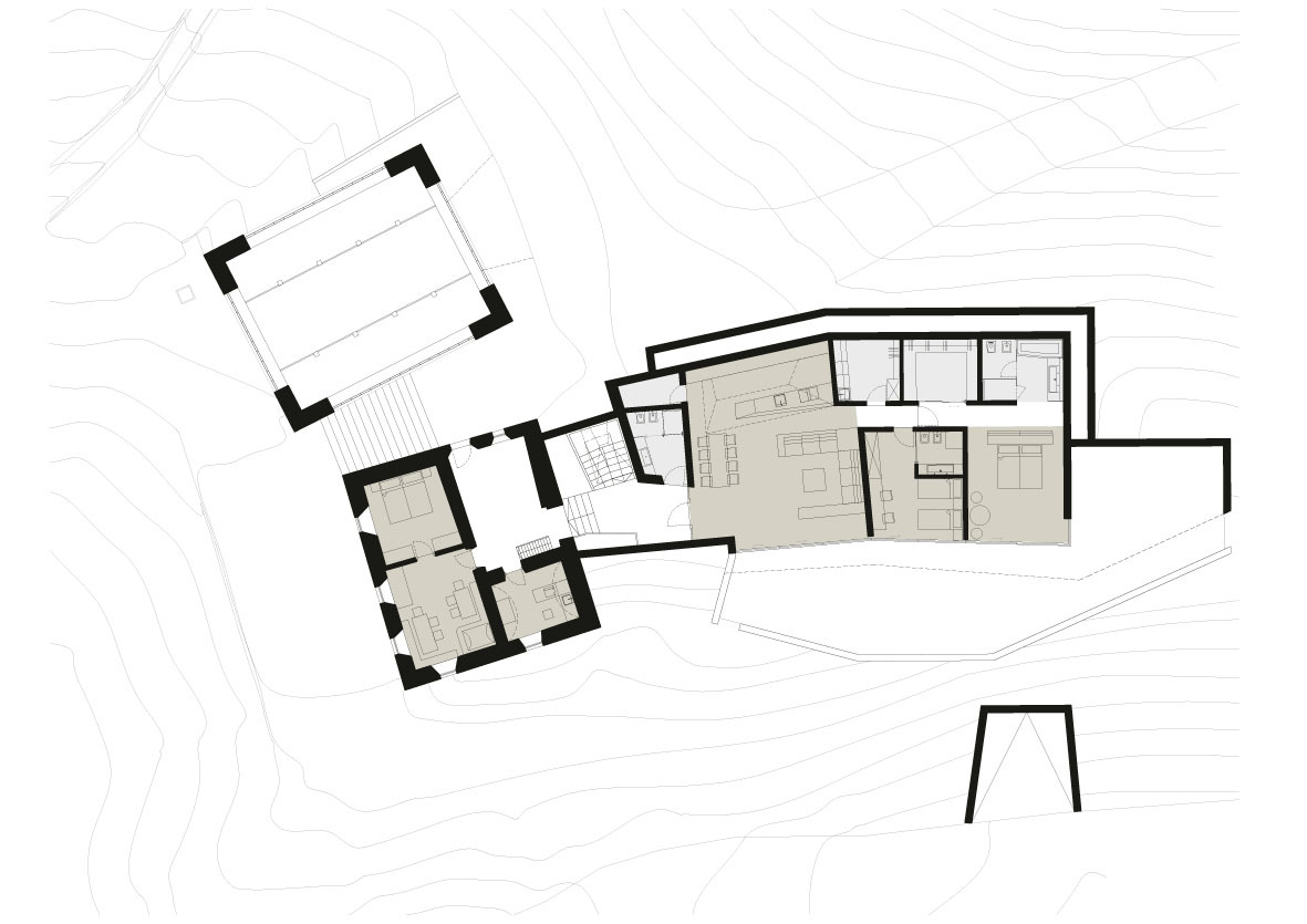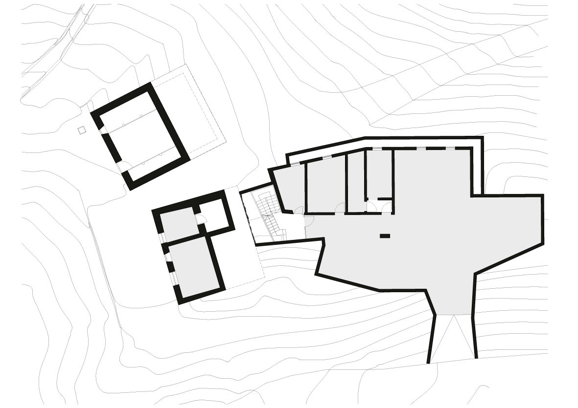 Nový objekt je orientovaný pozdĺž svahu a mierne lomený pôdorys sa prispôsobuje morfológii terénu. S pôvodným staviskom ho spája podzemné schodisko. Stavba má dve podlažia. V suteréne sa nachádza garáž, sklad a technické zázemie. Prízemie, z dvoch tretín skryté pod svahom, o sebe dáva vedieť dlhou presklenou fasádou. Hospodárske priestory – kúpeľňa, šatňa, sklad, špajza, kuchyňa a schodisko – sa skrývajú pod zemou na západnej strane, izolované masou zeminy. Nechýba tu však denné svetlo, preniká presklenými plochami v strope. Rozšírenie usadlosti Felder Hof ukazuje, ako sa historická budova môže spojiť s moderným, vysoko komfortným bývaním bez narušenia pôvodného rázu.