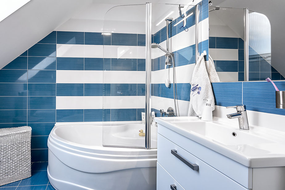 Po vstupe do domu sa ocitnete v zádverí, naľavo je vstup do obývacej izby a kuchyne – medzi zádverím a kuchyňou je komora na potraviny. Nasleduje chodba, vedúca do izby pre hostí alebo pracovne, priamo proti vchodovým dverám je spodná kúpeľňa a schodisko. Na poschodí je hlavná spálňa, šatňa, detská izba, pracovňa, ďalšia kúpeľňa a na podeste malá zóna s kreslom, ktorú momentálne pani domu využíva ako priestor na dojčenie.