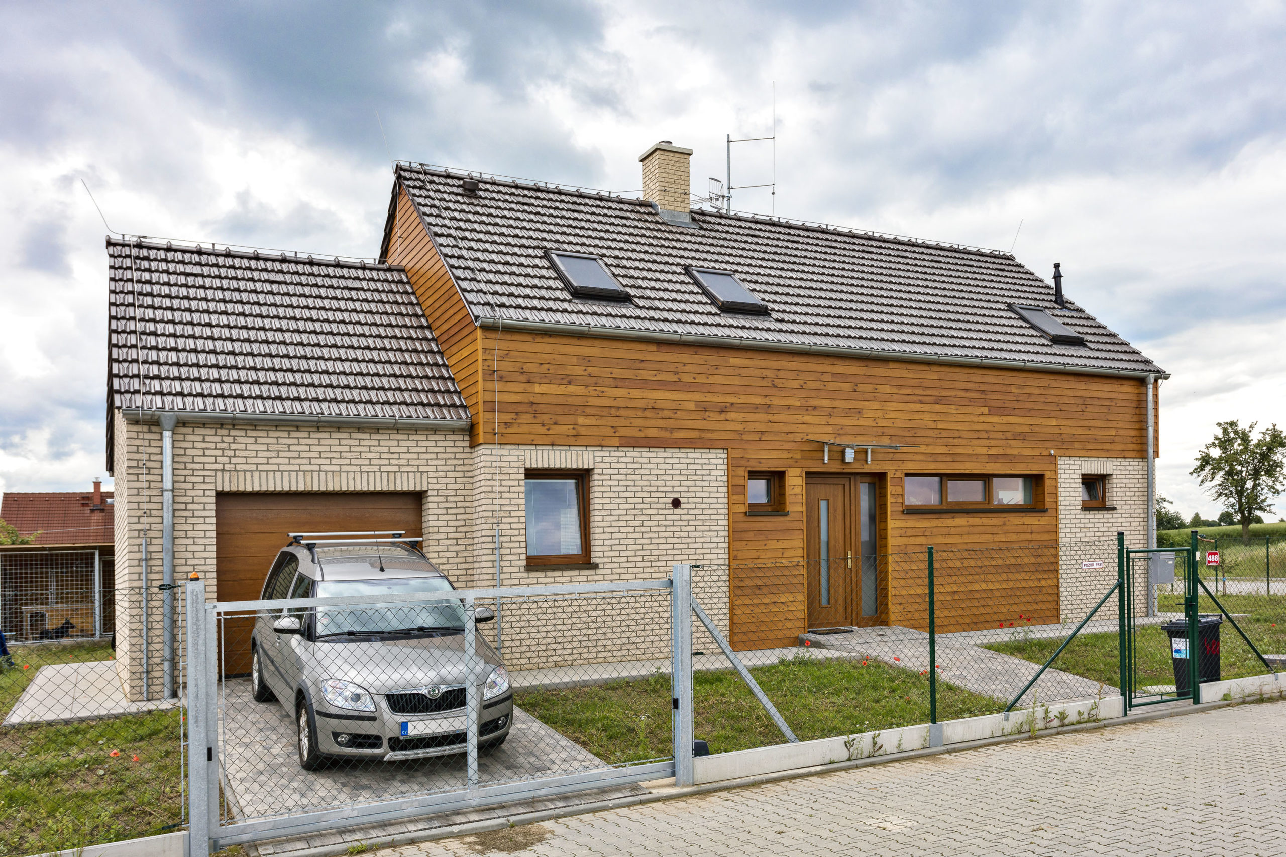 Obklad fasády: olejovaný sibírsky smrekovec na nosnom rošte, razené tehlové pásky