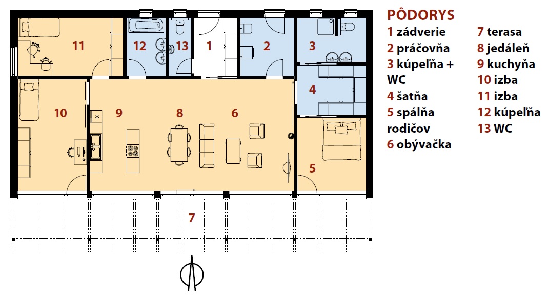Do domu sa vchádza zo severnej strany, cez zádverie s vstavanou skriňou sa dostanete k malej príručnej toalete a do priestrannej technickej miestnosti s elektrokotlom. Nasleduje ústredná obytná miestnosť, ktorá spája kuchynskú, jedálenskú a obývaciu časť domu. Po stranách sa nachádza rodičovská a detská spálňa s vlastným zázemím.