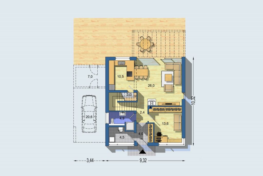 Rodinný dom novej generácie s dôrazom na energetickú úspornosť je vybavený najmodernejšími technológiami – tepelným čerpadlom s chladením, rekuperáciou a inteligentnou elektroinštaláciou. K energetickej úspore prispieva aj účelné rozloženie miestností s krátkymi inštalačnými rozvodmi a kompaktný tvar. Praktický pôdorys s veľkými izbami a dobre využitou dispozíciou s minimálnymi chodbami ušetrí miesto na pozemku. Veľká izba na prízemí môže slúžiť ako pracovňa, spĺňa však nároky aj na spálňu pre dve osoby. Na poschodí obyvatelia ocenia nadštandardne veľkú kúpeľňu a šatník.