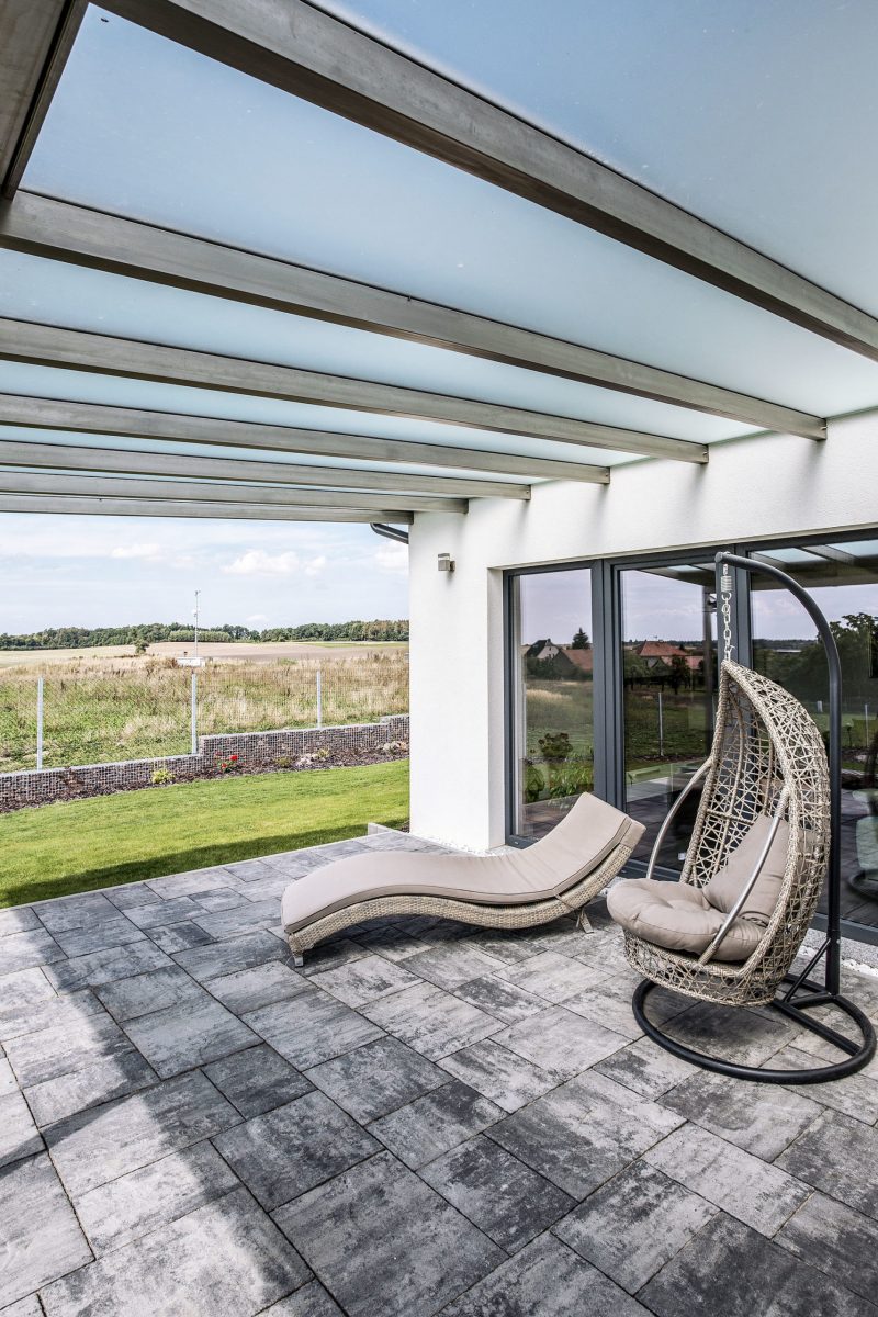 Celý priestor rozširuje zastrešená veranda, na ktorú nadväzuje záhrada. Pán Juraj sa rozhodol nevyužiť služby záhradného architekta. Postupné osadzovanie záhrady je pre oboch manželov odpočinkom. Všetko sa tu od základu riadi podľa feng šuej. Koníčkom majiteľa domu je opravovanie motocyklov, takže nesmie chýbať ani perfektne vybavená dielňa a garáž. Keď prídete do dielne, okamžite pochopíte, prečo je vlastník domu aj majiteľ úspešnej kovoobrábacej firmy. V dielni je absolútny poriadok, všetko je na svojom mieste a panuje tu absolútna čistota.