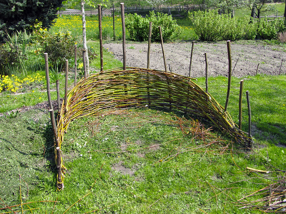 Okraj vyvýšených záhonov sa zhotovuje z rôznych materiálov, najtrvanlivejší je betón či kameň, najjednoduchšia býva konštrukcia z drevených dosiek či trámikov. Jana Nováková vytvára záhony vypletené čisto z prútia. „Je to síce prácne a trvanlivosť je obmedzená, stojí to však zato,“ hovorí s úsmevom a odporúča kvalitný výpletový materiál. Záhon z tenkého vŕbového prútia vydrží krásny dva, maximálne tri roky, zo silnejšej liesky alebo konárov ďalších drevín, ktoré máme po prerezávaní k dispozícii, vydrží asi dvojnásobok. Pozor však na niektoré dreviny, ktoré majú dobrú regeneračnú schopnosť, ich vetvičky môžu vyrážať. Je to napríklad vŕba, pajazmín či drieň,“ dodáva naša sprievodkyňa.