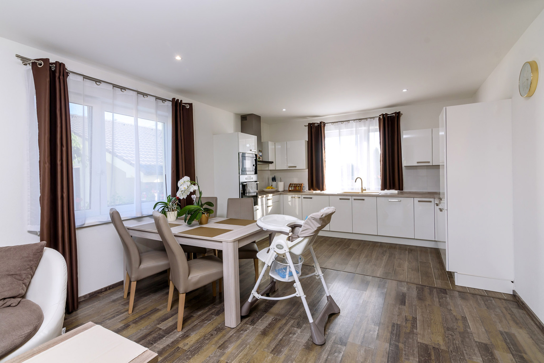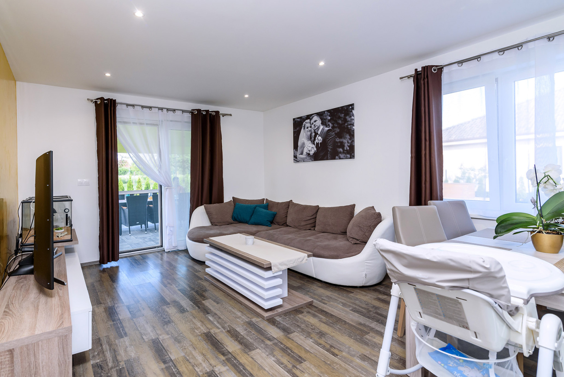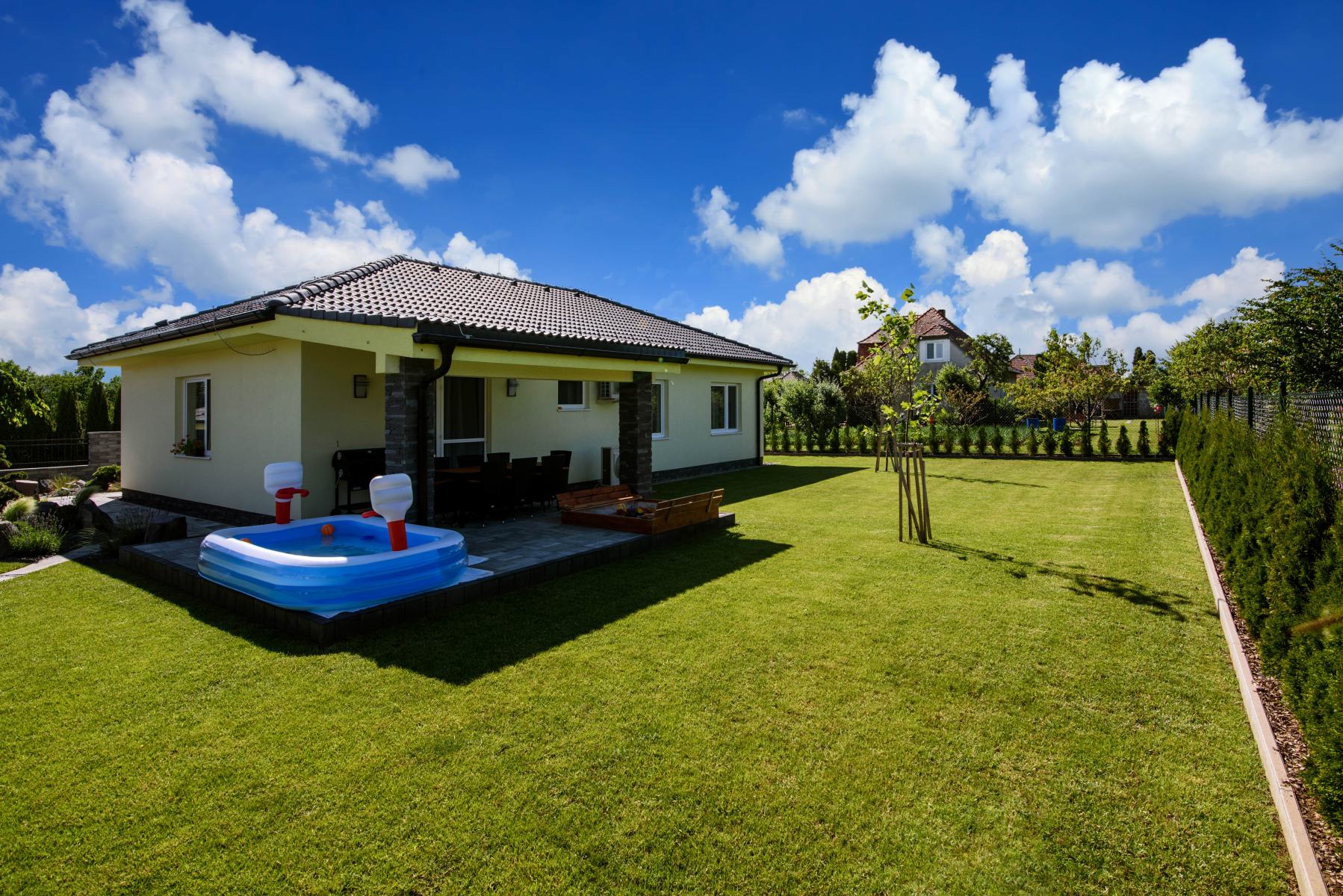 Hlavnou prednosťou domu je priestranne riešená obývacia izba, ktorá je stredobodom v dispozícii. Navrhnuté francúzske okná cez celú šírku miestnosti stierajú pocit bariéry medzi záhradou a vnútorným priestorom. Súčasťou vzdušnej obývacej izby je rozsiahly kuchynský kút. Obývacia izba, ktorá je príjemnou miestnosťou na stretávanie rodiny, slúži aj ako priestor, zaisťujúci súkromie ich jednotlivých členov. S uvedomením si, že stena medzi spálňou a detskou izbou nie je nikdy dostatočne silná, návrh tieto miestnosti oddeľuje nielen dvoma stenami, ale rovno celou šírkou obývacej izby. Naopak detské izby sú umiestnené vedľa seba, vďaka tomu bude možné túto časť domu meniť veľmi jednoducho. Skvelý kontakt so záhradou a jedinečné výhľady prinášajú všetky dôležité priestory. Hlavná spálňa poskytuje francúzskymi oknami vysnívaný výhľad rovno z postele. V lete možno celé presklenie otvoriť a vstúpiť do záhrady ihneď po prebudení.