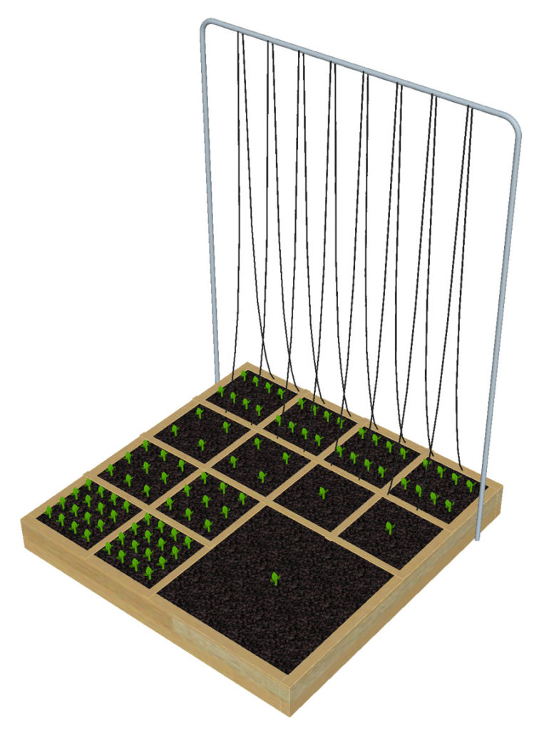 9 ks/políčko: mrkva, kríčková fazuľa, špenát, okrúhlica, červená repa, petržlen, koriander, prípadne cibuľa, cesnak a pór