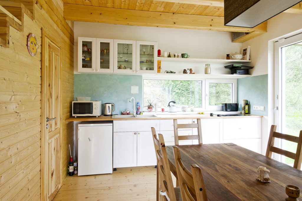 Takmer celé spodné podlažie tvorí veľká pobytová miestnosť s kuchyňou a jedálňou, z ktorej možno vstúpiť cez pergolu na záhradu. Je presvetlená z troch strán – z východu, juhu a západu. Všetky pobytové miestnosti sú orientované na juh. Okná sú vybavené izolačnými dvojsklami. Dom vykurujú kozubové kachle na tuhé palivo s teplovzdušným rozvodom do miestností na druhom poschodí. Prípadné doplnkové kúrenie zaisťujú elektrické ohrievače.