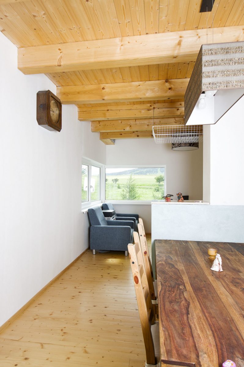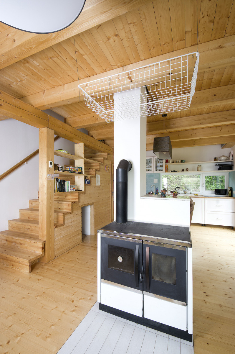 Takmer celé spodné podlažie tvorí veľká pobytová miestnosť s kuchyňou a jedálňou, z ktorej možno vstúpiť cez pergolu na záhradu. Je presvetlená z troch strán – z východu, juhu a západu. Všetky pobytové miestnosti sú orientované na juh. Okná sú vybavené izolačnými dvojsklami. Dom vykurujú kozubové kachle na tuhé palivo s teplovzdušným rozvodom do miestností na druhom poschodí. Prípadné doplnkové kúrenie zaisťujú elektrické ohrievače.