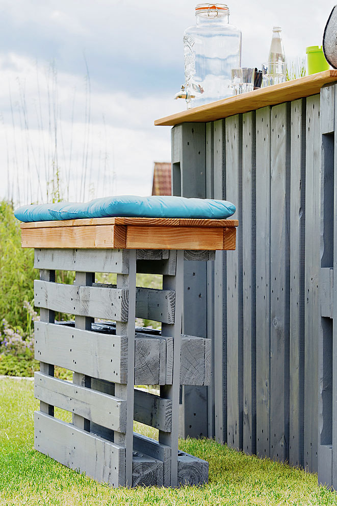 Pripravte si tri najlepšie a najstabilnejšie palety. Položte dve palety na seba a priskrutkujte ich. Tretiu paletu použite na operadlo. Postavte ju na dlhšiu stranu a na niekoľkých miestach ju poriadne priskrutkujte. Operadlo musí byť stabilné a vydržať záťaž. Výrobu sedenia môžete ľubovoľne upravovať – predĺžiť alebo zvýšiť. Výhoda paliet je, že si môžete nábytok poskladať na skúšku a zoskrutkovať, až keď si budete istí finálnou podobou.