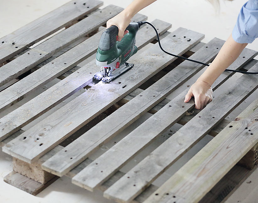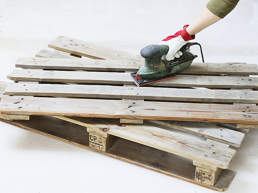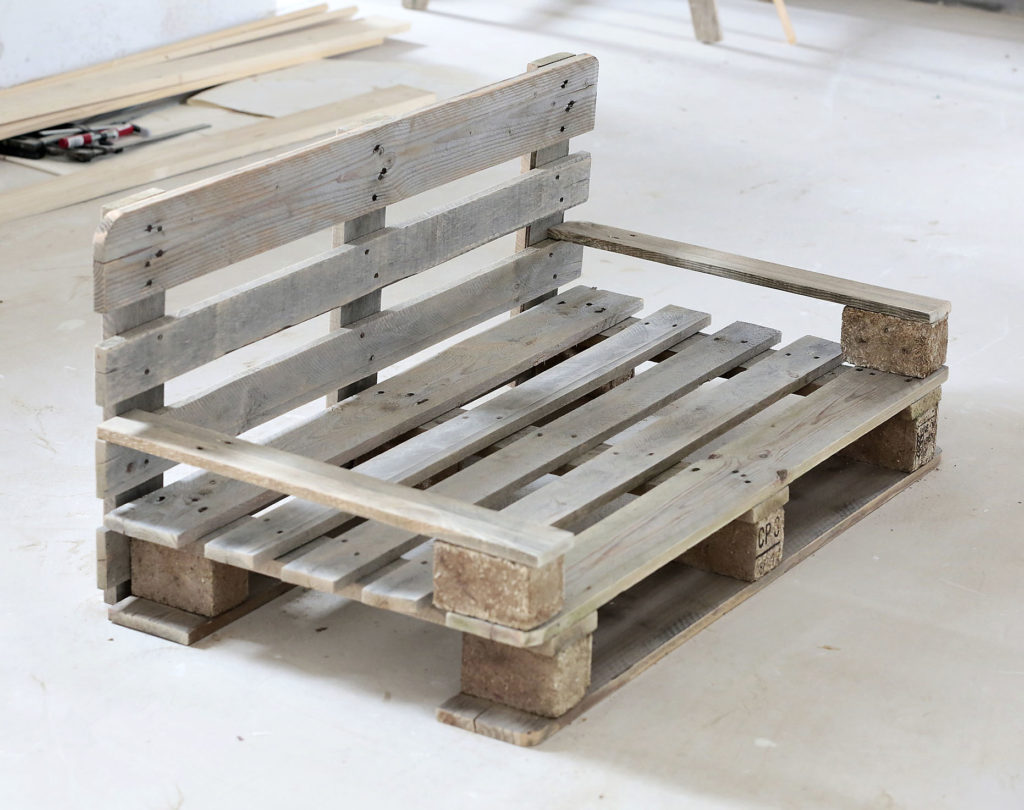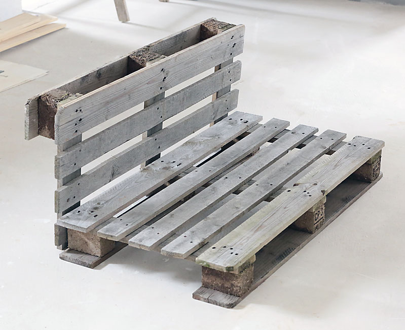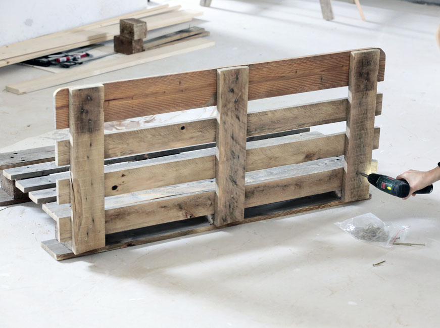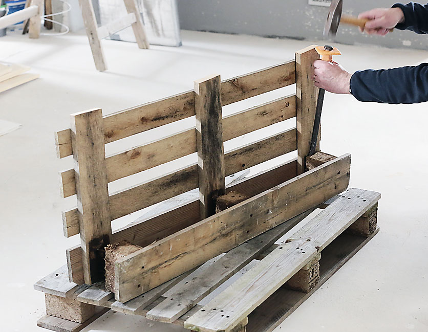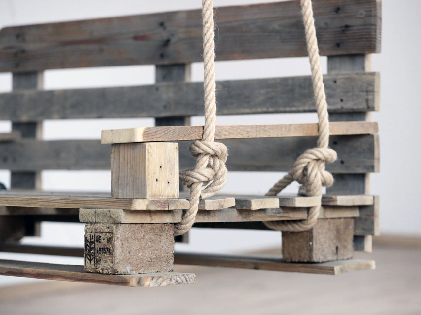 6. Jednotlivé časti poskladajte do tvaru hojdačky. Kocky a dve laty z inej palety použite na bočné strany hojdačky.