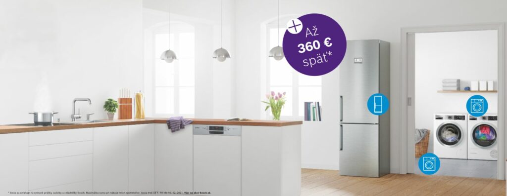 Pokiaľ si do 15. decembra 2021 kúpite niektorý z vybraných spotrebičov Bosch (v akcii sú vybrané chladničky, práčky, kombinované práčky so sušičkou a sušičky bielizne), môžete získať časť peňazí späť. Podrobnejšie informácie a podmienky nájdete na registračnej stránke akcie-bosch.sk.