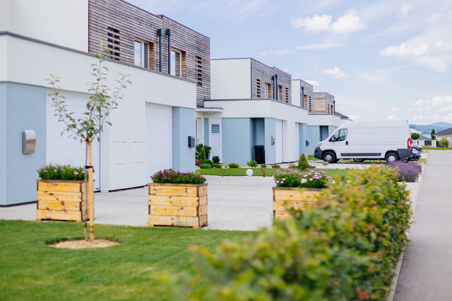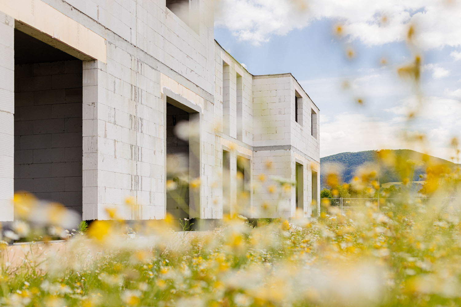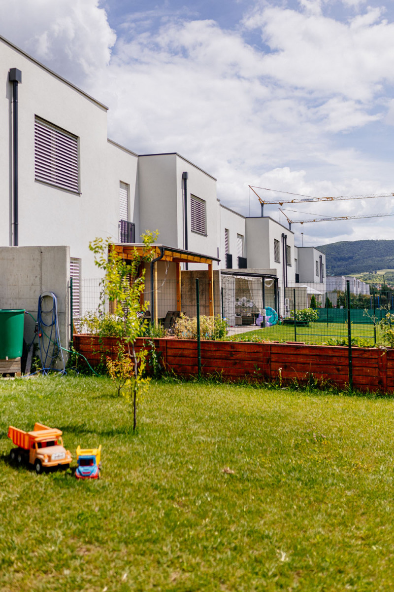 Domy sú postavené s ohľadom na budúcnosť stavebníctva i majiteľov – je tu zrejmá snaha ponúknuť bezstarostné mestské bývanie aj znalosť vývoja nových noriem. Do tejto koncepcie zapadá tiež voľba stavebného materiálu – obvodové murivo je z tepelnoizolačných tvárnic značky Ytong, tento systém bol použitý aj u vnútorných priečok. „Výhodu Ytongu vidíme v tom, že je homogénna a vhodným zabudovaním je možné pomerne jednoducho realizovať potrebnú vzduchotesnú obálku domu. S materiálom Ytong dokážeme efektívne zabrániť vznikom tepelných mostov. To je pre domy, ktoré sme chceli doviesť na hranicu pasívnych hodnôt, dôležité. Aj vďaka ľahkej spracovateľnosti Ytong prispieva k variabilite priestoru – napríklad prízemná obytná časť je koncipovaná tak, aby si finálne umiestnenie kuchyne zvolili majitelia. A materiál, do ktorého sa dobre umiestňujú zariaďovacie prvky, im umožní ľahkú realizáciu,“ uvádza k voľbe materiálu pán Rehák.