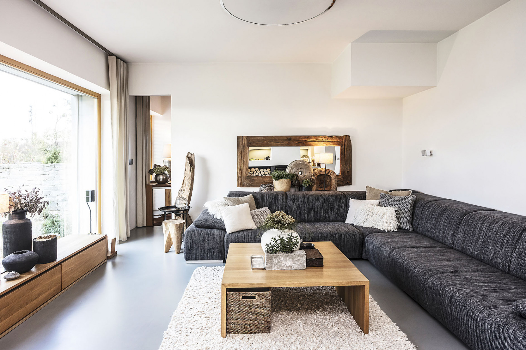 Tvarové poňatie vychádza jednak z miestneho tradičného staviteľstva, jednak integruje moderné prvky bývania, ako je garáž alebo jedáleň s presklením, ktorá je prepojená s terasou a záhradou. Architekt použil zaujímavý optický trik, vďaka ktorému má dom z hornej strany do istej miery proporciu prízemného domu.