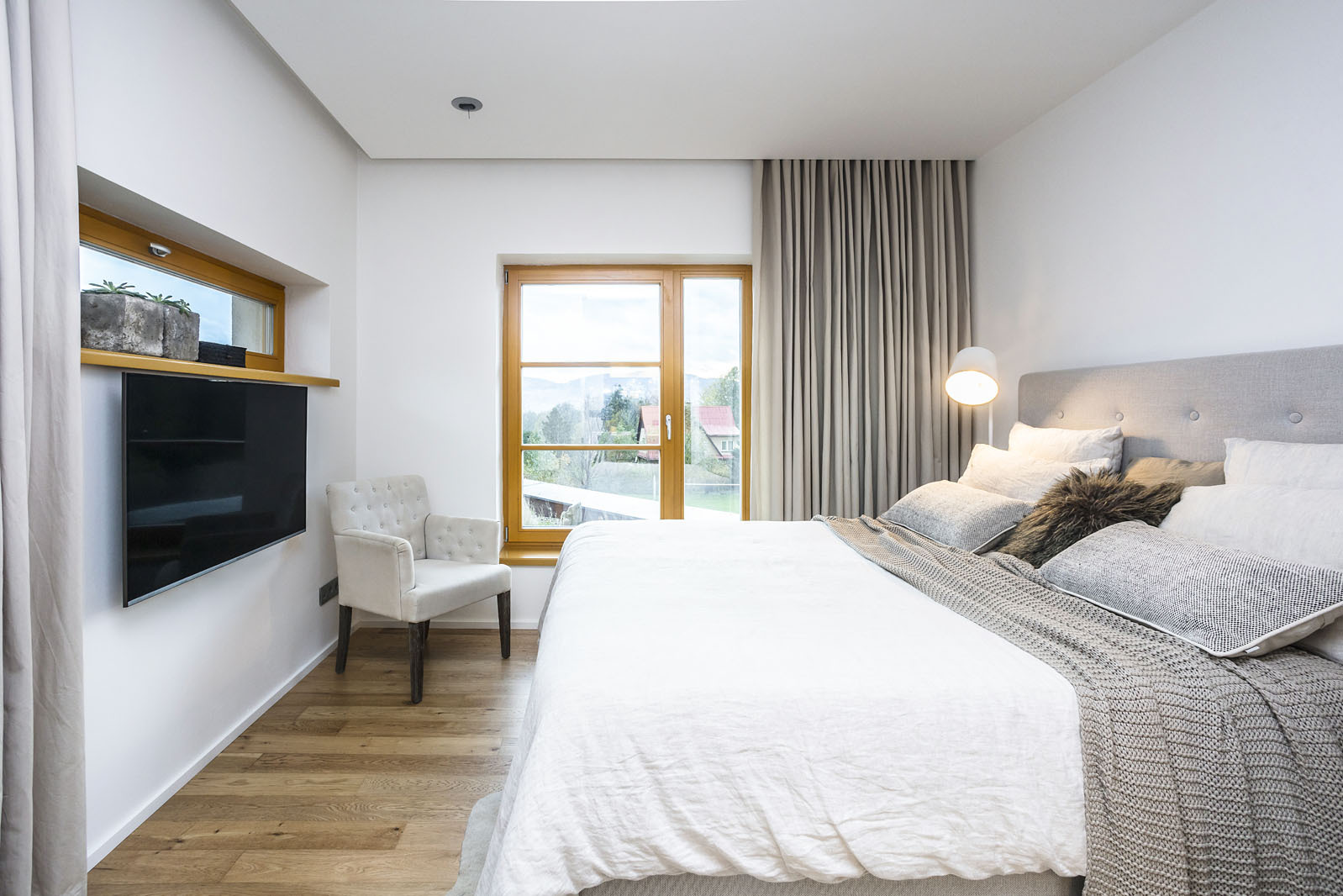 Od začiatku sa pri návrhu domu počítalo s nevyužitým podkrovím. Vďaka tomu sa architekt vyhol oknám a vikierom, ktoré by vyzerali nepatrične. Hore je odvetraný klasický podkrovný priestor a dom je zateplený až z úrovne stropu.