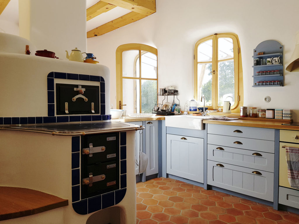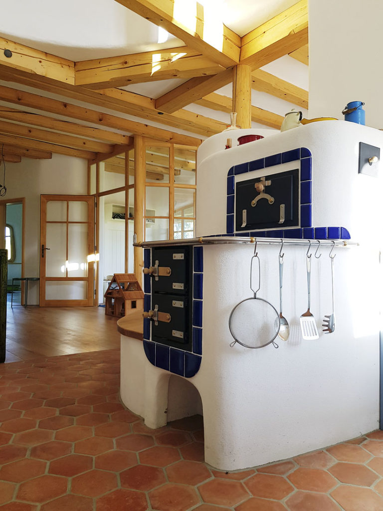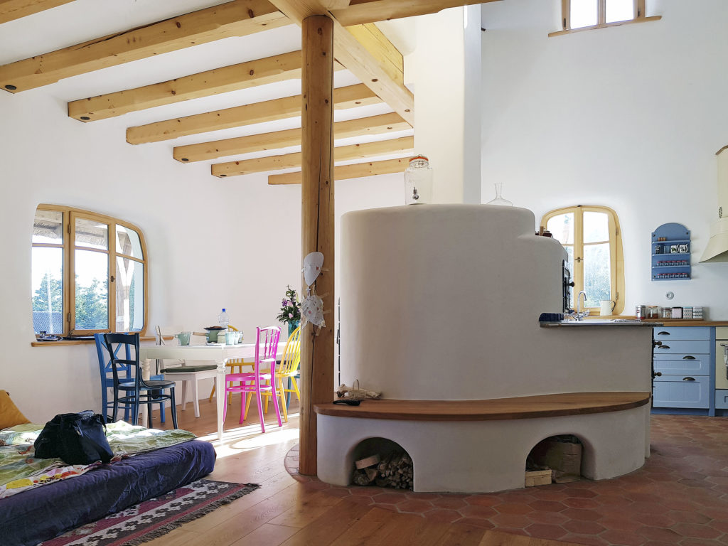 Vykurovanie v dome je sálavé, stenové a dlážkové (v kúpeľniach). Doplnkovým zdrojom tepla a nádhernou dominantou interiéru je pec na drevo s dvomi ohniskami. Jedno slúži ako sporák na varenie a je otočené do kuchyne, druhé smeruje do obývacej izby a k jedálenskému stolu. „Keď sa v peci zakúri, vydrží nahriata celú noc a nasledujúci deň. V dome sa tak môže stlmiť hlavný zdroj vykurovania. Nad pecou totiž nie je strop a teplo sa šíri takmer do celého domu. Veľký otvorený priestor nad kuchyňou a pecou presvetľuje severozápadná časť prízemia svetlom zo strešných južných a západných okien,“ dodáva architekt.