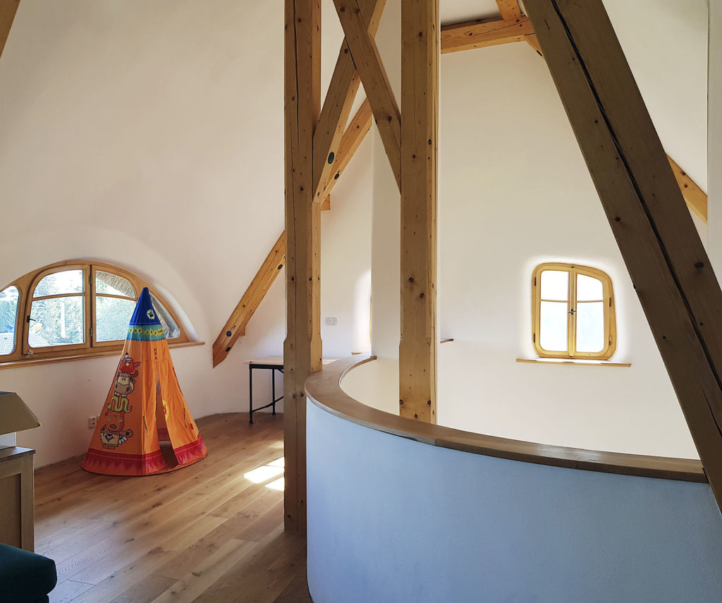 „S majiteľmi sme si priali, aby vnútri podkrovia bol čo najviac otvorený priestor. Tak sú obe hlavné väznice pod hrebeňom uprostred krovu podopreté šikmými stĺpikmi, ktoré tvoria vzpery. Tieto šikmé vzpery roznášajú váhu do strán k obvodovým múrom. Tým sa priestor vnútri opticky uvoľnil,“ dodáva architekt. Konštrukcia krovu sa súčasne riešila aj esteticky a spoluvytvára estetický a umeleckoremeselný charakter tohto úplne unikátneho domu.