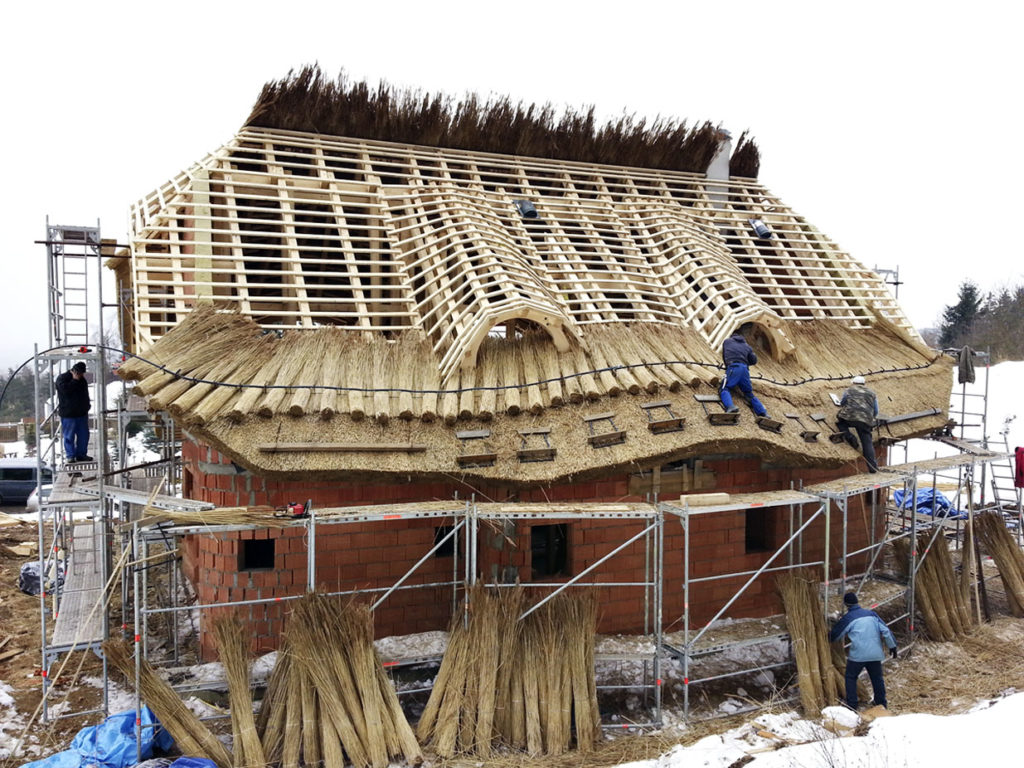 Veľkou výzvou pre architekta bola bezpochyby konštrukcia krovu a realizácia slamenej strechy, vykonanej v spolupráci s firmou a tesárom, ktorý sa na podobné stavby špecializuje. Od začiatku museli všetky tvary vikierov a presahy striech starostlivo konzultovať. Slamené strechy vyžadujú sklon minimálne 45 °, vo veterných oblastiach minimálne 50 ° (čím je strecha strmšia, tým má krytina dlhšiu životnosť) a plynulé tvarové prechody medzi vikiermi. Väznice sú z interiéru viditeľné a nesú vlastne väčšinu váhy strechy.