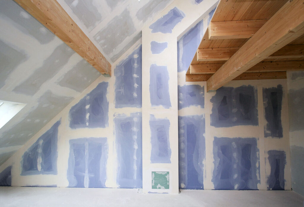 ▪ Následne pretmeľte škáry, prípadne väčšie plochy tenkou vrstvou tmelu. Prácu vám zjednoduší striekaný finálny tmel.