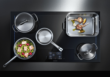 Indukčné dosky studioLine ponúkajú celopovrchovú indukciu s možnosťou voľného umiestnenia riadu na doske alebo univerzálnu technológiu flexIndukcia, ktorá varné zóny spája (SIEMENS)