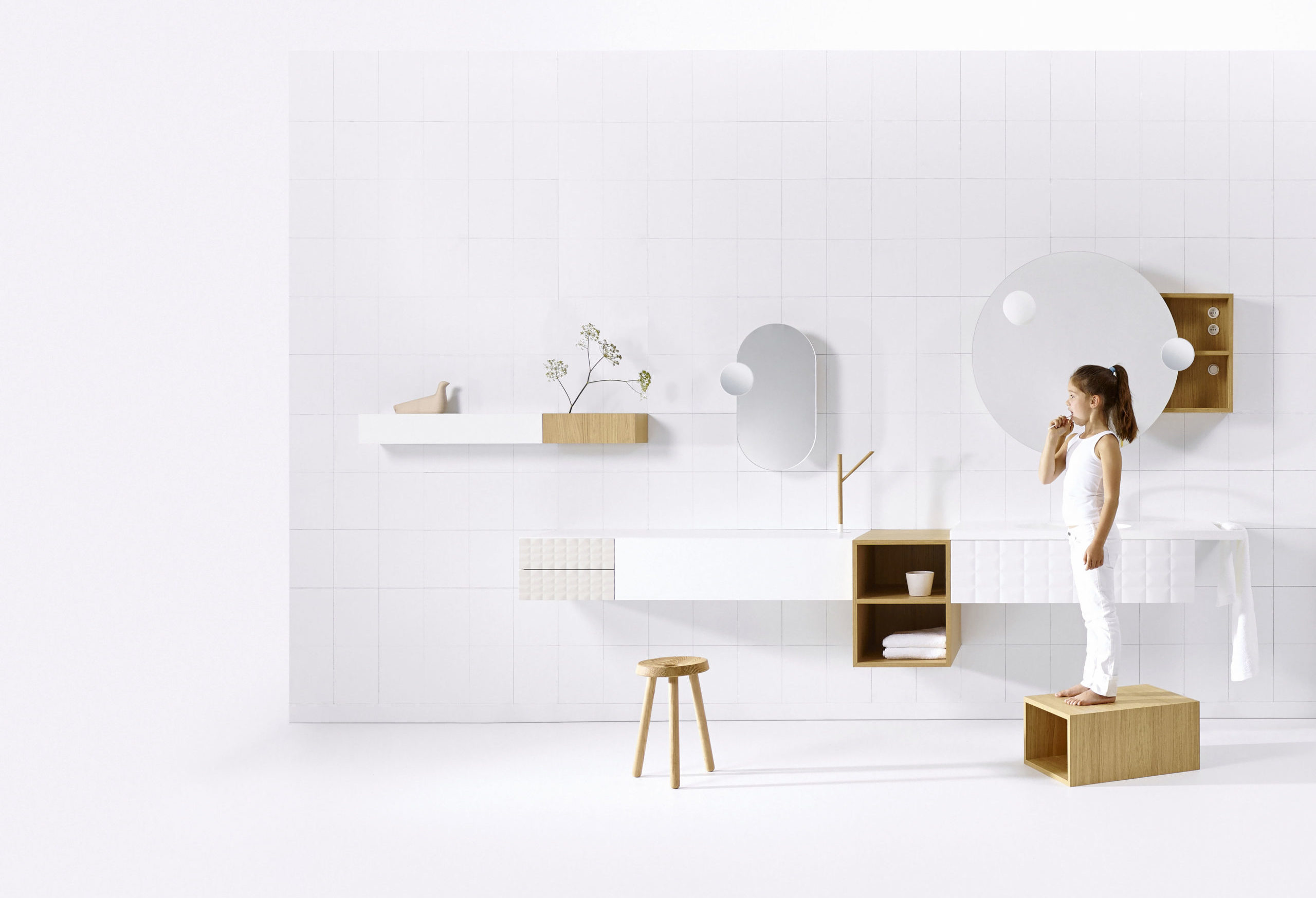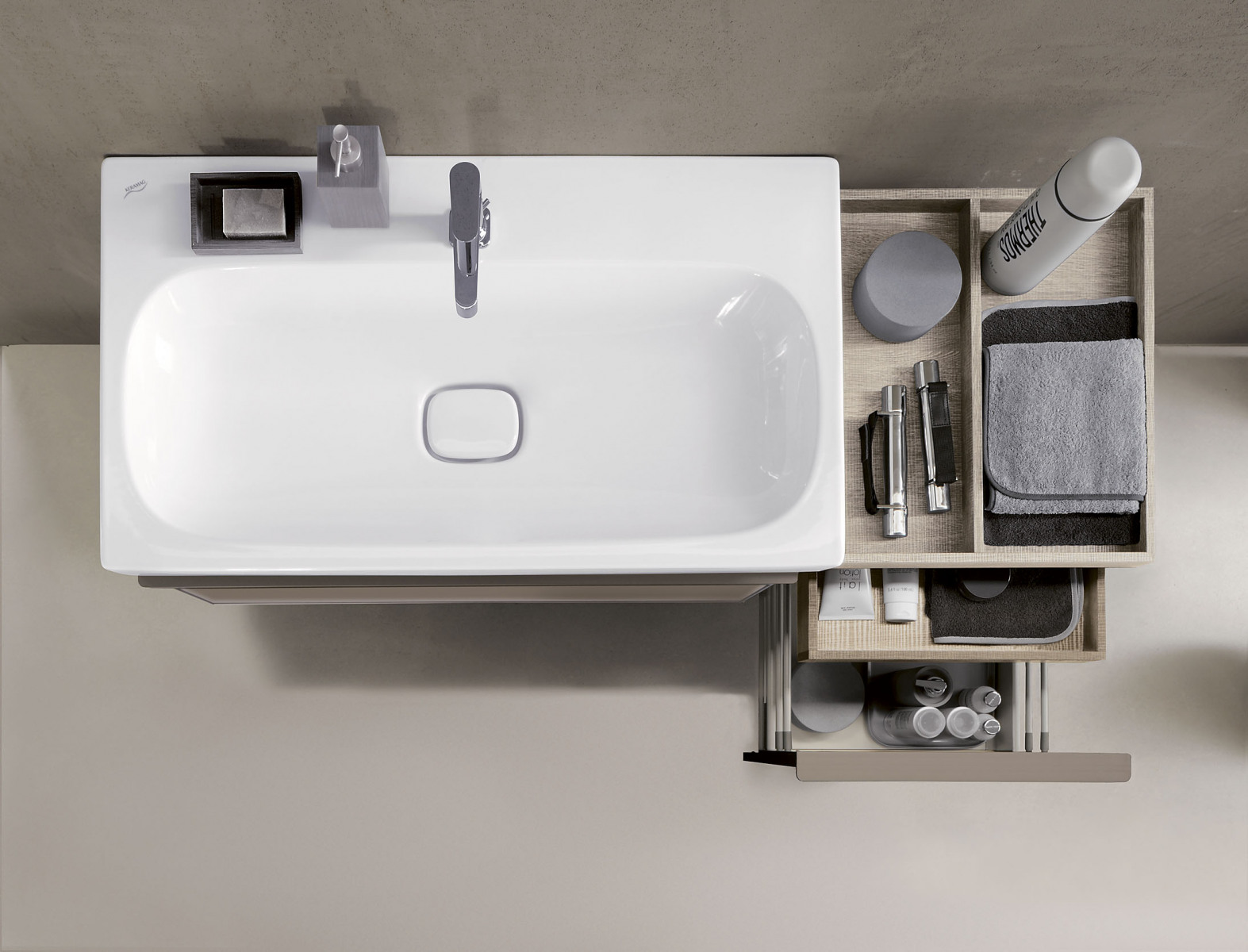 S tým, ako sa kúpeľňa časom transformovala na malé domáce spa, sa zmenilo aj usporiadanie nábytku. Viac než po vertikálnej osi sa dnes rozvíja horizontálne tak, aby užívateľom ponúklo čo najviac odkladacej plochy v okolí umývadla. Na horizontálnu líniu nadväzujú čoraz obľúbenejšie zásuvky namiesto klasických políc, ktoré sú ukryté za dvierkami a poskytujú okamžitý prehľad o kúpeľňovom inventári.