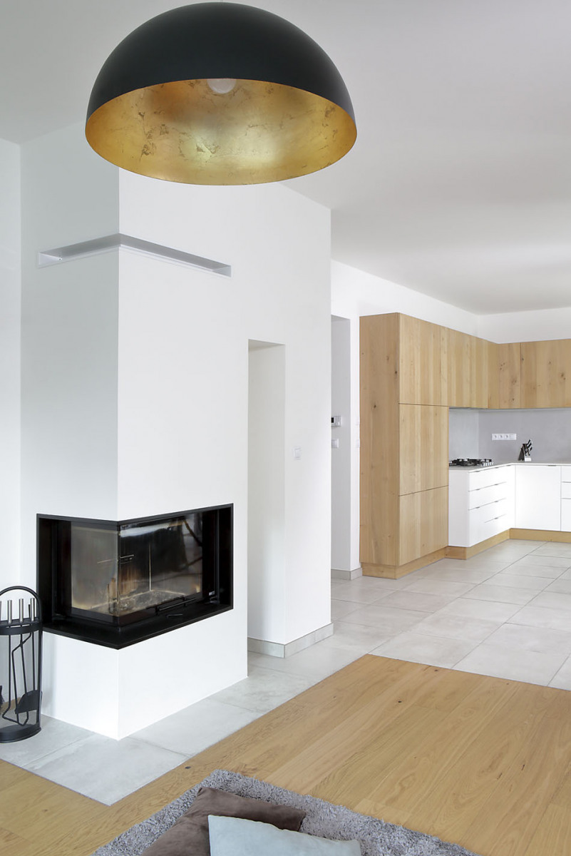 Časť vybavenia domu pochádza z pôvodného bytu rodiny. Niektorý nábytok vyrábal stolár na mieru, napríklad kuchynské skrinky (podľa návrhu ateliéru Sféra) alebo skrine v predsieni, spálni a kúpeľni. Dlážka je výsledok kompromisu medzi predstavami manželov. Čiastočne ju tvoria dubové trojvrstvové lamely celoplošne lepené a čiastočne keramické dlaždice, ktoré si majitelia doviezli z Talianska. Vykurovanie v prízemí zabezpečuje dlážkové kúrenie, na prvom poschodí radiátory. V obývacej izbe je umiestnený kozub, z ktorého vedie prieduch hore na poschodie, kde vyhrieva chodbu.