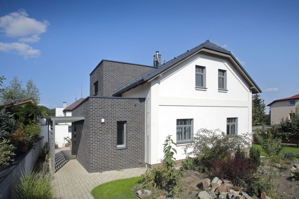 Podstatných zmien sa dočkal dom aj zvonku. Na západnej strane domu bola tvarovo zjednodušená prístavba domu, ktorá slúži ako hlavný vchod. Dôležitým krokom bola aj výmena plastových okien za drevené a úprava ich proporcií. Na prízemí vymenili okno v súčasnej kuchyni za vchod priamo na záhradu, vďaka čomu sa šikovne prepojil interiér s exteriérom. Na prvý pohľad je zrejmé, že sa úplne premenila fasáda domu. Zmizli pôvodné pruhy pieskovcových farieb a pribudla hlavná rímsa a ďalšie plastické prvky v tmavom odtieni. Prístavba teraz výrazne kontrastuje hlavnej časti domu. Dom pôsobí elegantne a dobre zapadá do okolitej zástavby.