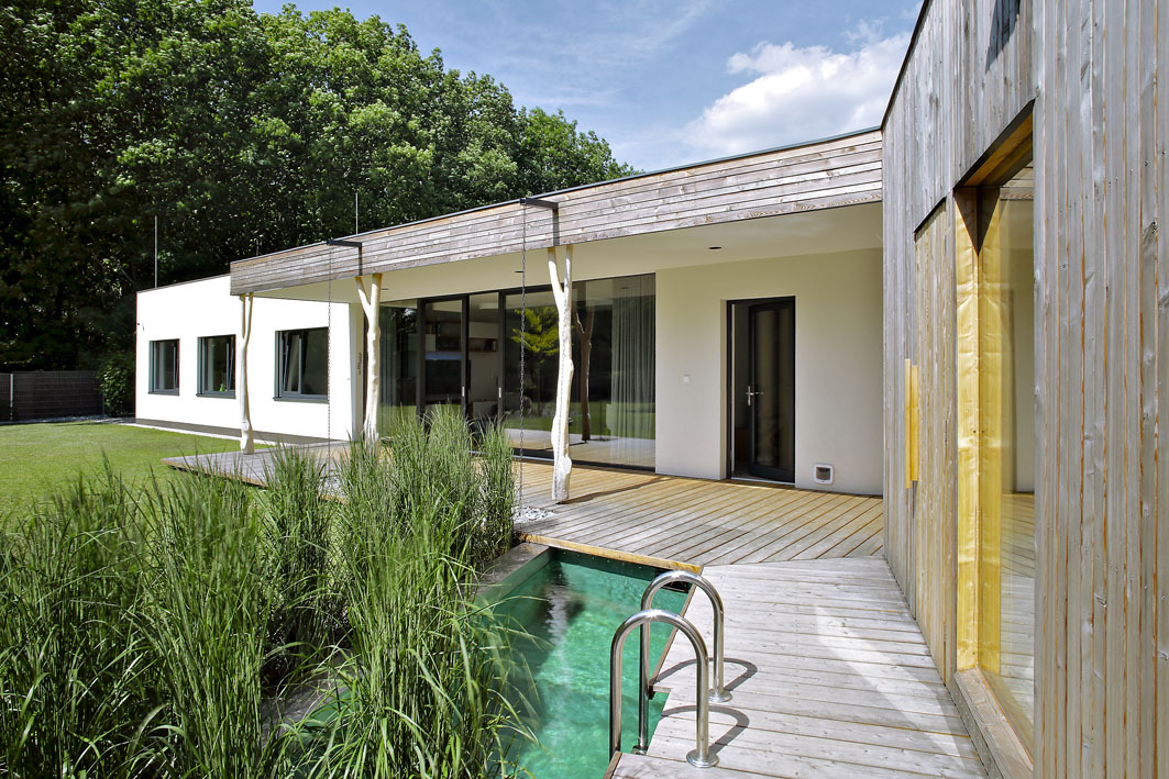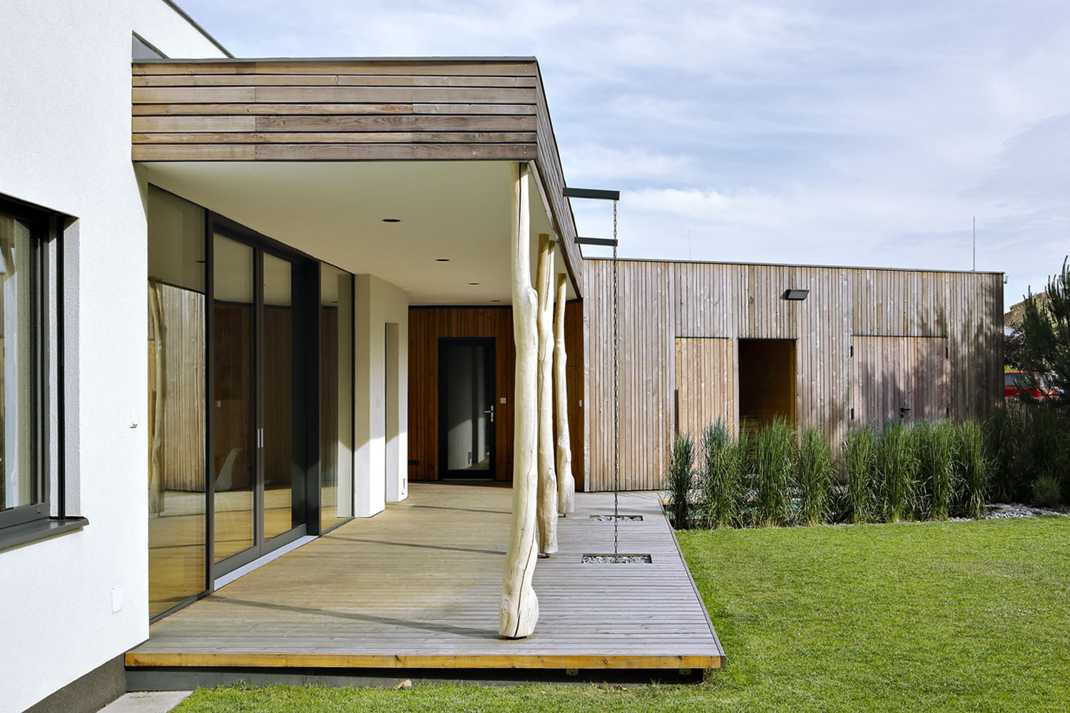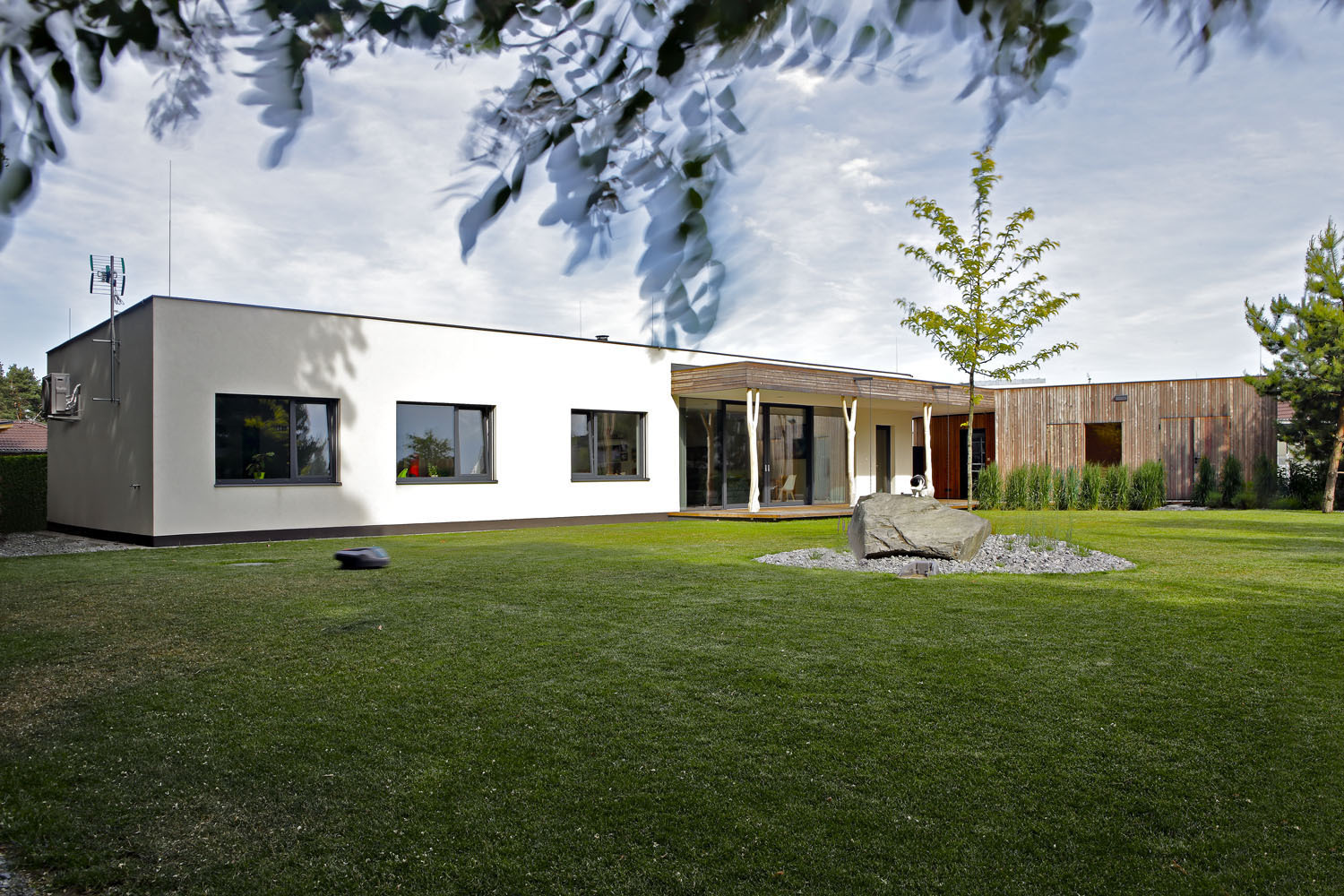 Hoci to pri pohľade z ulice nemusí byť zjavné, dom srší nápadmi a architektonicky originálnymi riešeniami počnúc vlastnou stavbou a jej šikovným priestorovým riešením na pozemku, garážou pokračujúc, cez interiér, záhradu po saunu a bazén. Všetko vymyslené do detailu, funkčne a pekne. Dom sa skladá z dvoch hmôt. Obytnú časť tvorí jednoduchý obdĺžnikový hranol, z ktorého vystupuje nižší objekt garáže so saunou tvaru nepravidelného polygónu reagujúceho na tvar pozemku. Obe hmoty sa čiastočne prekrývajú, aby z ulice nebolo vidno do záhrady. Priechod do záhrady je zjemnený zaoblenými rohmi umožňujúcimi plynulejší prechod do domu. Dom má jedno nadzemné podlažie a nie je podpivničený. Prepojenie obývacieho priestoru s krytou terasou, resp. záhradou, zaisťuje „stopercentné“ presklenie od podlahy po strop a po celej šírke miestnosti.