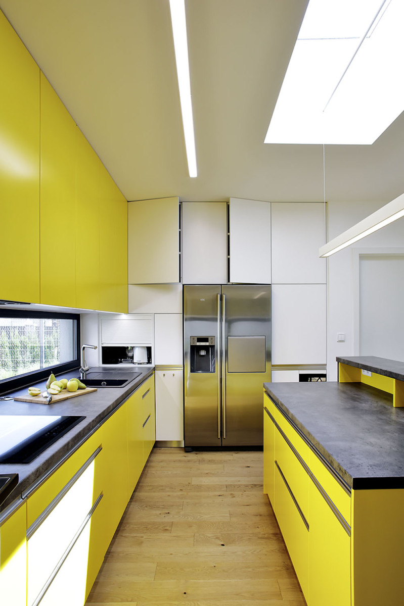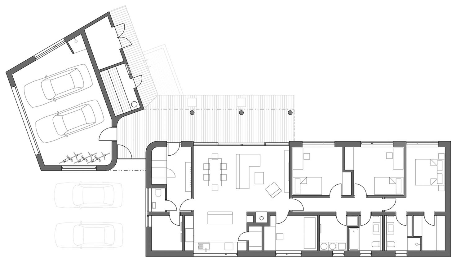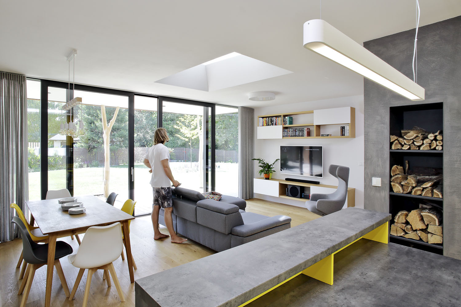 Hoci to pri pohľade z ulice nemusí byť zjavné, dom srší nápadmi a architektonicky originálnymi riešeniami počnúc vlastnou stavbou a jej šikovným priestorovým riešením na pozemku, garážou pokračujúc, cez interiér, záhradu po saunu a bazén. Všetko vymyslené do detailu, funkčne a pekne. Dom sa skladá z dvoch hmôt. Obytnú časť tvorí jednoduchý obdĺžnikový hranol, z ktorého vystupuje nižší objekt garáže so saunou tvaru nepravidelného polygónu reagujúceho na tvar pozemku. Obe hmoty sa čiastočne prekrývajú, aby z ulice nebolo vidno do záhrady. Priechod do záhrady je zjemnený zaoblenými rohmi umožňujúcimi plynulejší prechod do domu. Dom má jedno nadzemné podlažie a nie je podpivničený. Prepojenie obývacieho priestoru s krytou terasou, resp. záhradou, zaisťuje „stopercentné“ presklenie od podlahy po strop a po celej šírke miestnosti.