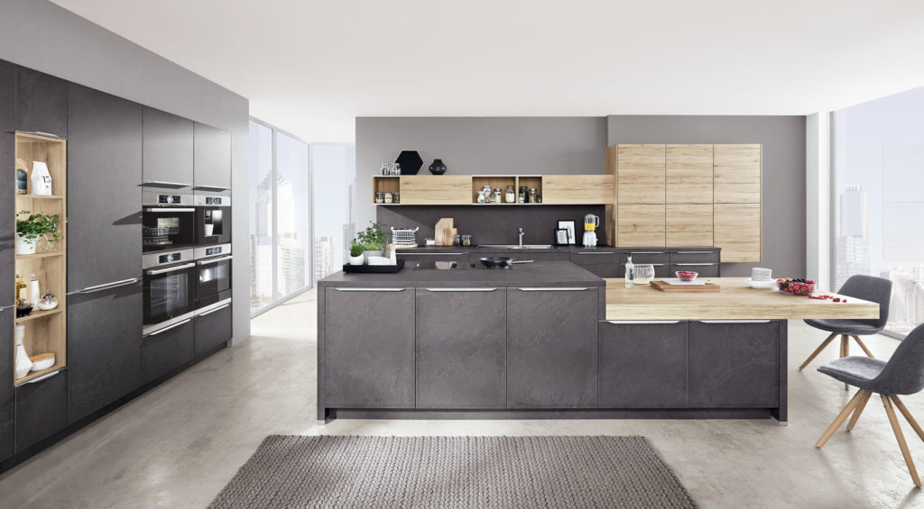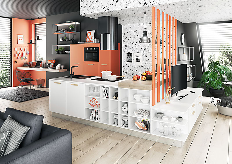 K osvedčeným a priestorovo úsporným riešeniam patrí rozdelenie kuchyne na kompaktnú zostavu pri stene (najlepšie na celú výšku stropu), ktorá obsahuje úložné priestory, vstavané spotrebiče – chladničku, prípadne rúru, mikrovlnku, kávovar atď. – a na ostrovček s varnou zónou a pracovnou plochou. Umývaciu zónu môžete umiestniť pri stene (jednoduchšie pripojenie na vodu a odpad), alebo v rámci ostrovčeka. Toto riešenie je technicky aj finančne náročnejšie, treba preveriť, kadiaľ priviesť vodu a odpad.