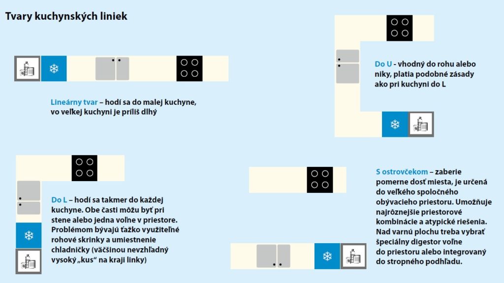 Zostavenie linky do jednej priamej línie by bolo väčšinou príliš dlhé (v priemerne veľkej kuchyni cca 6 metrov), veľa by ste sa nabehali tam a späť. Preto je účelnejšie usporiadať linku do tvaru L, U alebo zvoliť kombináciu s varným ostrovčekom. Komunikačnú líniu v kuchyni tak tvorí trojuholník.
