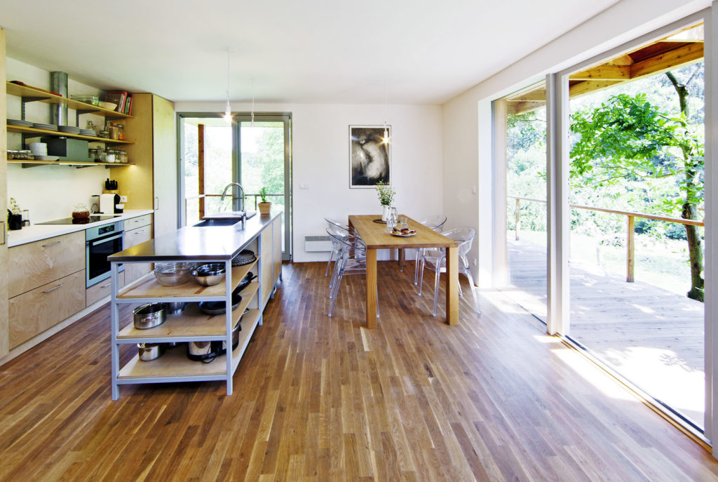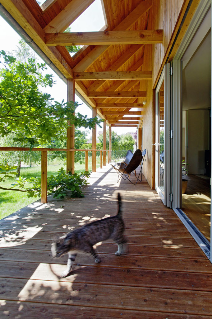 Koncepcia tradičného domu si tu dobre rozumie s požiadavkami na moderné nízkoenergetické a ekologické stavby. Dispozíciu lemuje zo severnej strany pozdĺžna chodba, ktorá slúži ako vstupná a priechodná z východu na západ. Chráni dom zo severu, tepelne izoluje obytnú časť a zároveň ju oddeľuje od susedov. Naopak na juhu a východe je prízemie plne presklené, bezrámové zasklené steny sa striedajú s bezbariérovými výstupmi na krytú terasu.