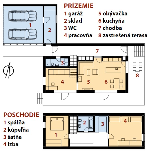 Funkčné zóny na seba prehľadne nadväzujú od kuchynskej a jedálenskej časti cez obývaciu izbu až po pracovňu. Terasa na východnej strane nadväzuje na kuchyňu, je širšia a slúži na stolovanie. V podkroví je zo schodiskovej haly, ktorá slúži aj ako šatňa, prístupná detská izba, spálňa rodičov a kúpeľňa. Vedľa domu stojí kryté garážové státie so skladom.