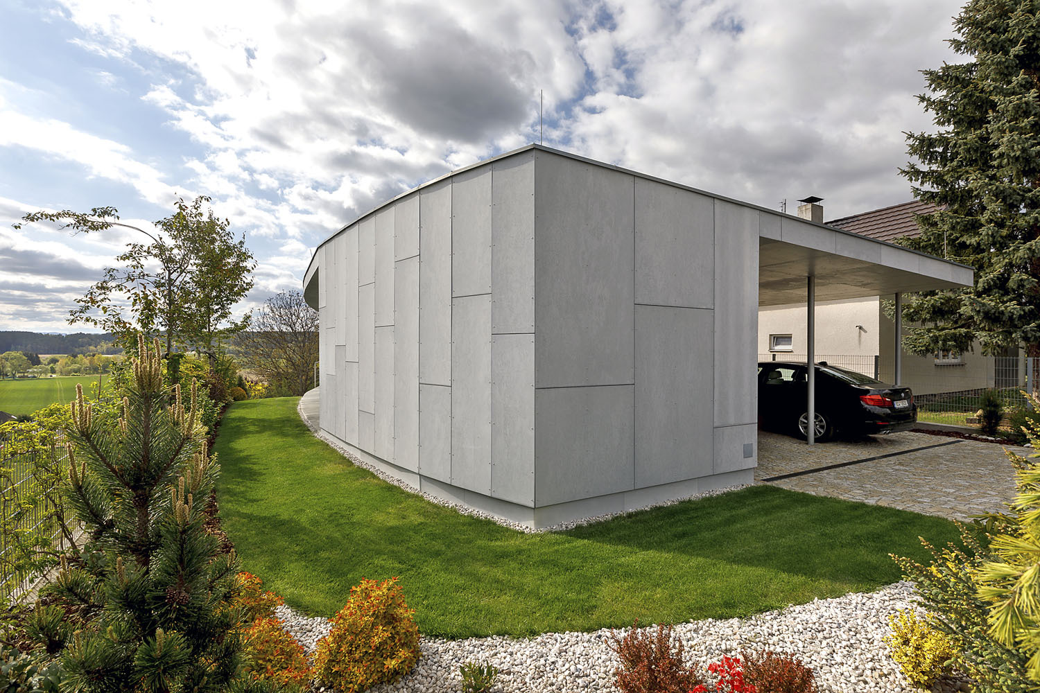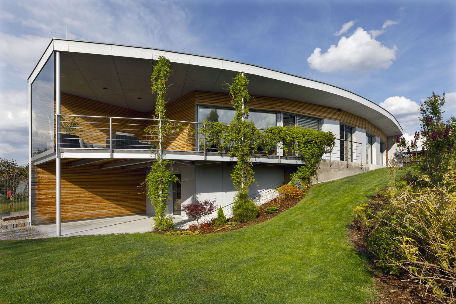 Keď sa začala predávať parcela na kopci s neopakovateľnými výhľadmi, majitelia sa rozhodli, že si na nej postavia dom. Aj keď už jeden mali o niekoľko desiatok metrov ďalej. Vysnenými výhľadmi sa dnes kochajú vďaka „zelenému“ tehlovému domu s rozsiahlymi zasklenými plochami. Do oblúka prehnutá krivka celej južnej strany ich vťahuje do okolitej krajiny a poskytuje im výhľady na tri svetové strany.