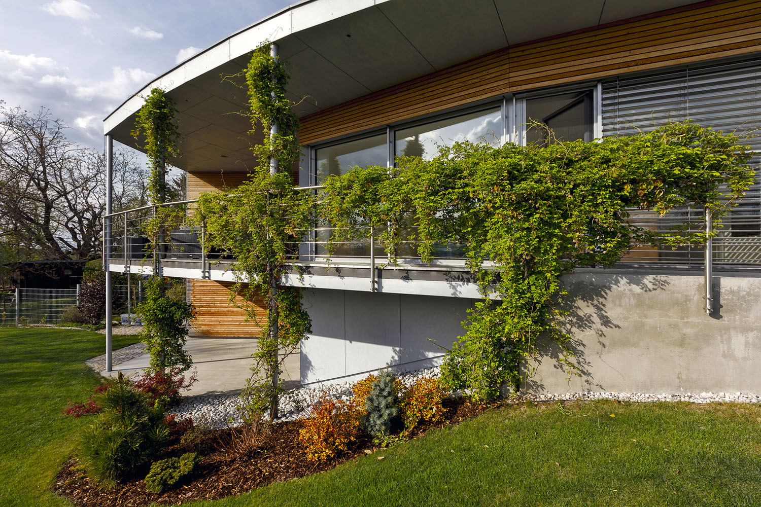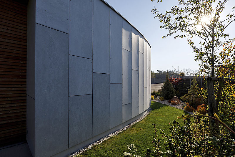 „Celá južná stena domu je oblúková, najväčšiu dynamiku zaoblenia dosahuje oblúk v obývacej izbe. Dôvodom bola snaha oddialiť obytné priestory od hranice pozemku a zaistiť súkromie a tie najlepšie výhľady do okolia. Tradičný kváder by bol agresívny, miestnosti by boli vtlačené príliš blízko k susednému pozemku a chýbal by ten intímny odstup vyplnený záhradou. Tvar domu je vďaka oblúku jemný a prirodzený,“ vysvetľuje ideu architekt Ing. Josef Vostracký.
