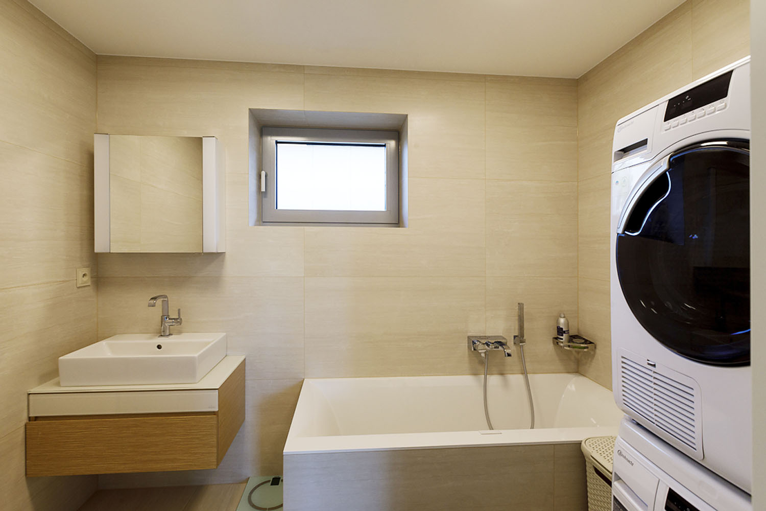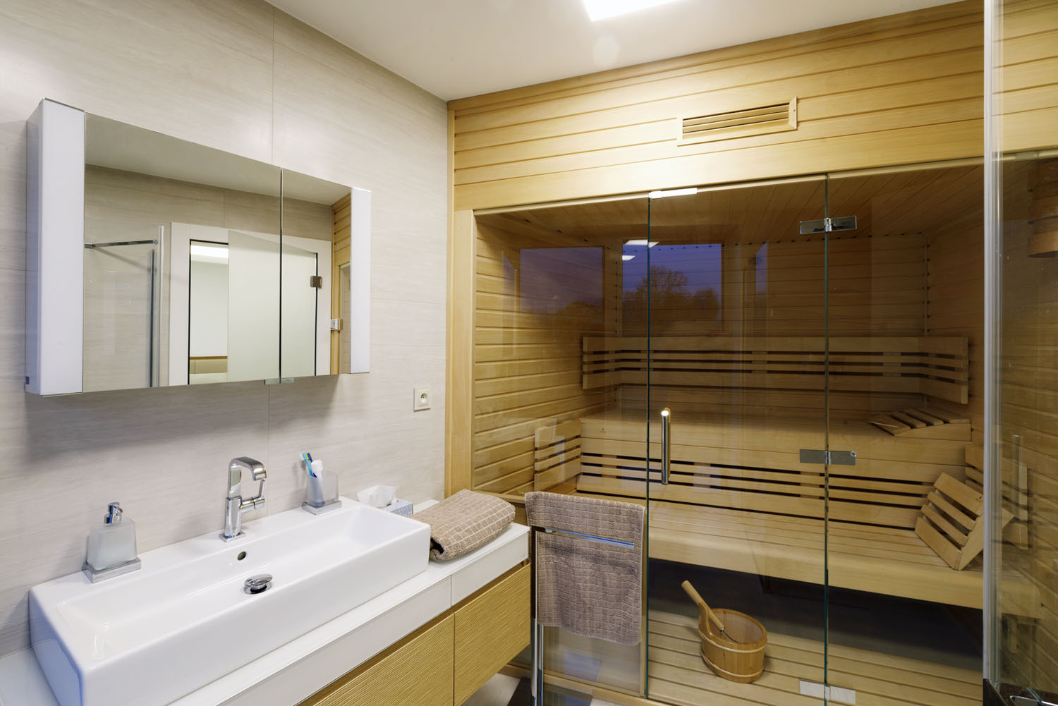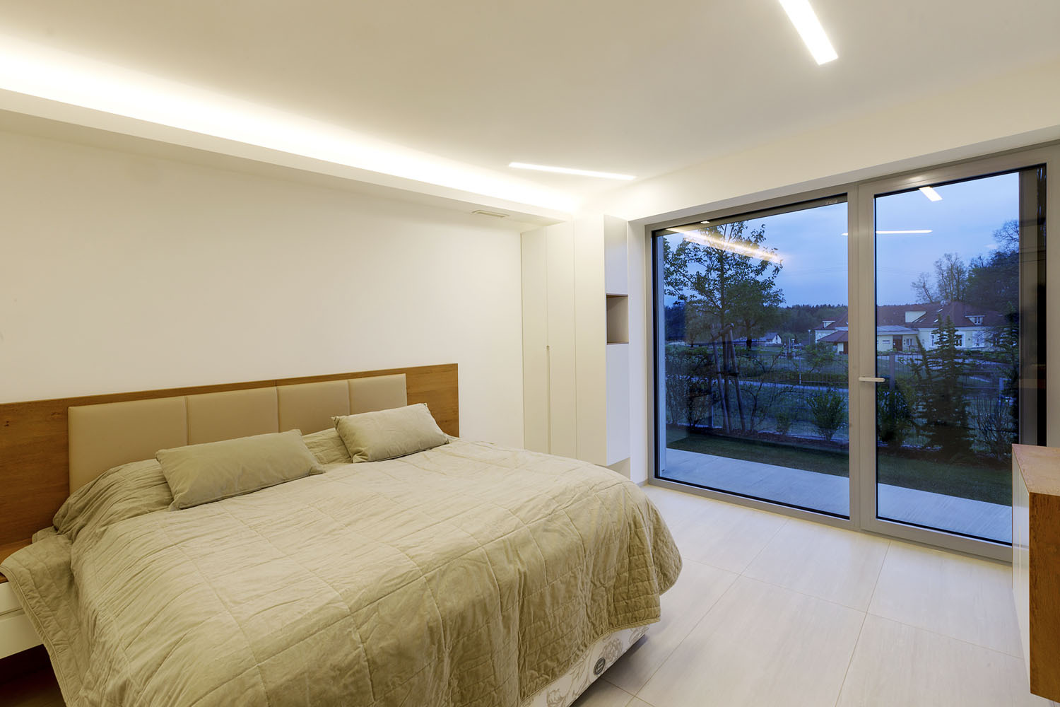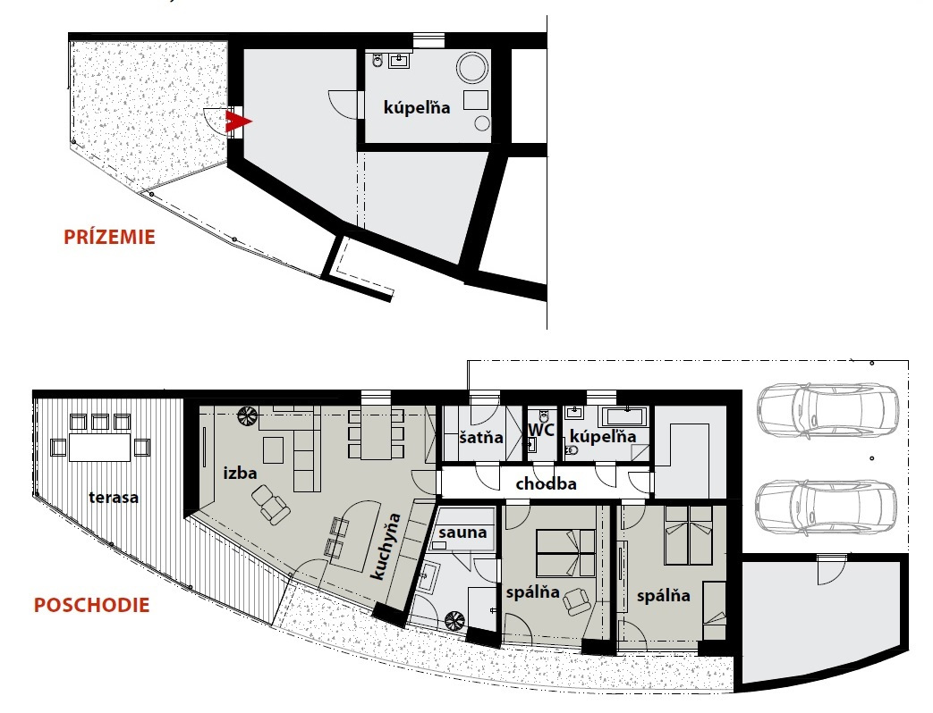 Dve parkovacie miesta sú umiestnené pod presahom strechy, pod ktorým obyvatelia dôjdu až k hlavným dverám na severnej strane. Za zádverím je chodba a z nej sú prístupné všetky miestnosti, denná časť s kuchyňou, jedálenským kútom a zasklenou obývacou izbou smerujúcou na juh, aj ďalšie dve izby, toaleta, kúpeľňa a šatňa. Spálňa má vlastnú kúpeľňu so saunou.