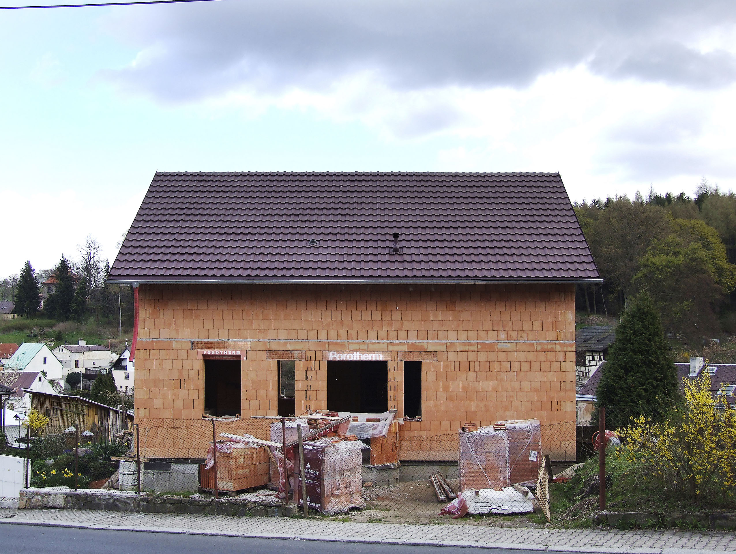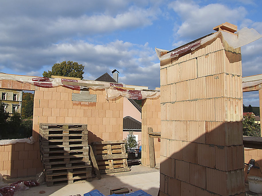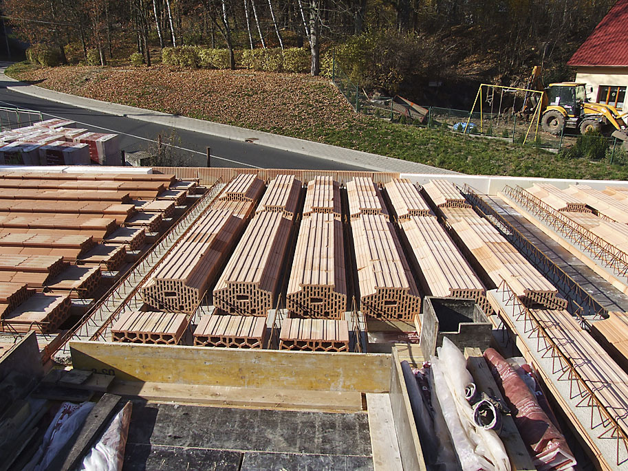Prišiel kamión, pán Klouček si požičal paletový vozík a rozvozil materiál po obvode dosky. „Tých paliet bolo tridsaťpäť, čo paleta, to tona. Každá tehla prechádzala rukami niekoľkokrát. A to boli len tehly. Výrobca konštrukčného systému nám pomohol so založením stavby na základovej doske, na dvoch alebo troch ďalších radoch sa podieľal aj murár. Potom odišiel na dovolenku a čas ubiehal. Zvyšok predstavenia – čo deň, to jeden rad obvodového muriva – sa odohrával v réžii s obsadením jedného muža. To všetko za dozoru skúseného profesionála, stavebného inžiniera. Úskalia prišli až pri montáži stropu, napoly skladačky a napoly monolitu. Statik našťastie všetko máličko predimenzoval a opäť pomohol stavebný dozor, zohnal šalovacie dosky, podpery a ľudí.“