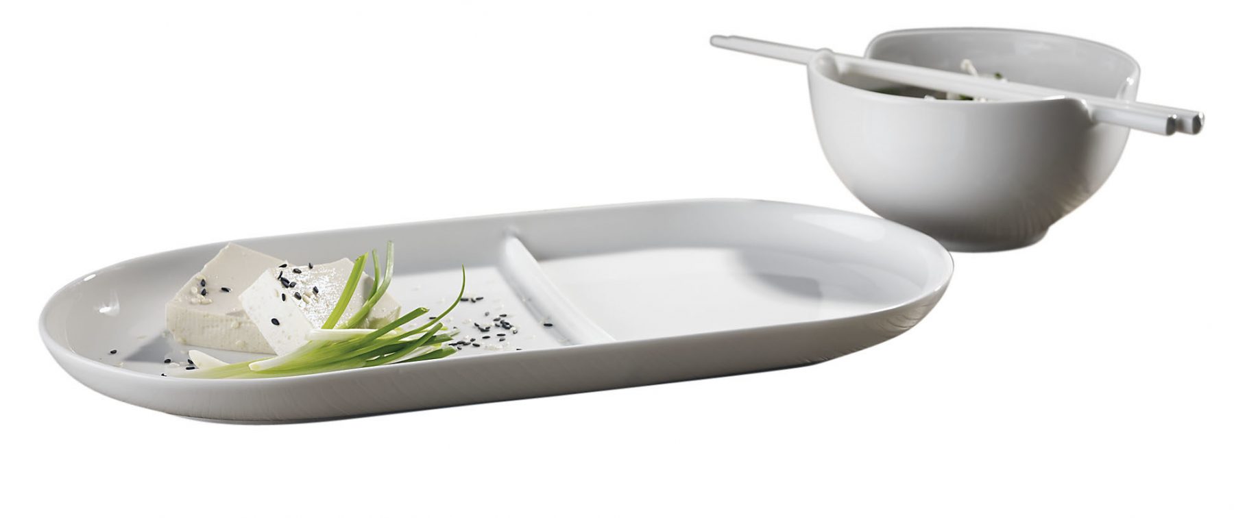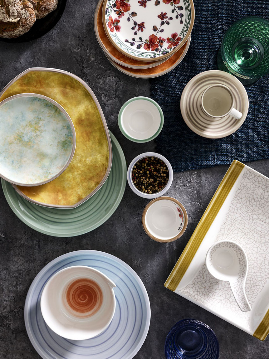 Kráľom jedálenskej tabule zostáva biely porcelán, úspešne mu však konkurujú ďalšie materiály a povrchové úpravy, predovšetkým porcelán a keramika s matnou glazúrou v prírodných farbách – antracitovej, hnedej, šedej či béžovej – a inšpirované japonskou a čínskou kultúrou. Zaujímavo pôsobia glazúry s metalickým efektom, imitujúce patinované železo, meď či strieborné kovy. Trendy farbami sú okrem zemitých odtieňov aj tlmená ružová a zelená.