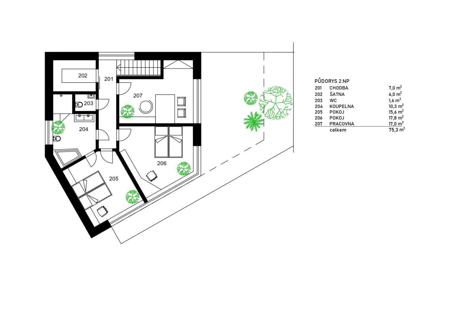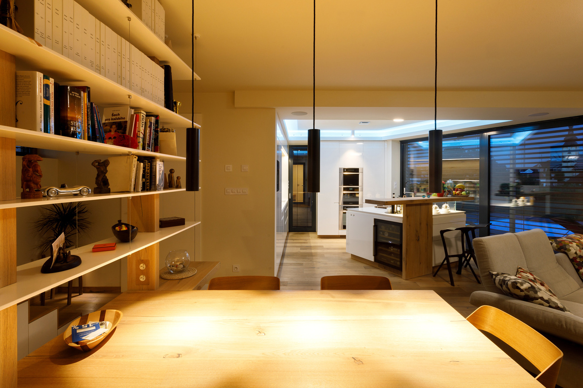 Úžitková plocha: rodinná časť 132 m2, spoločenská časť 61 m2, garáž 61 m2, zastrešená terasa 38 m2